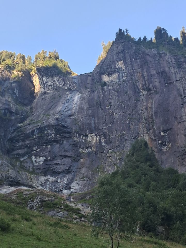 Vielleicht halten die rostigen 8mm Bohrhaken einen 10 Meter-Sturz (wird als Option reichlich angeboten), vielleicht auch nicht. Das weiß keiner. Wir haben deshalb nach der 2. SL abgeseilt. Stände sind besser. Die vermeintlich schattige NO-Wand ist eher eine O-Wand und hat den ganzen Vormittag pralle Sonne (war auch ein Grund zum Umkehren bei Hitze). Vom Wasserfall war nur ein dünnes Rinnsal übrig