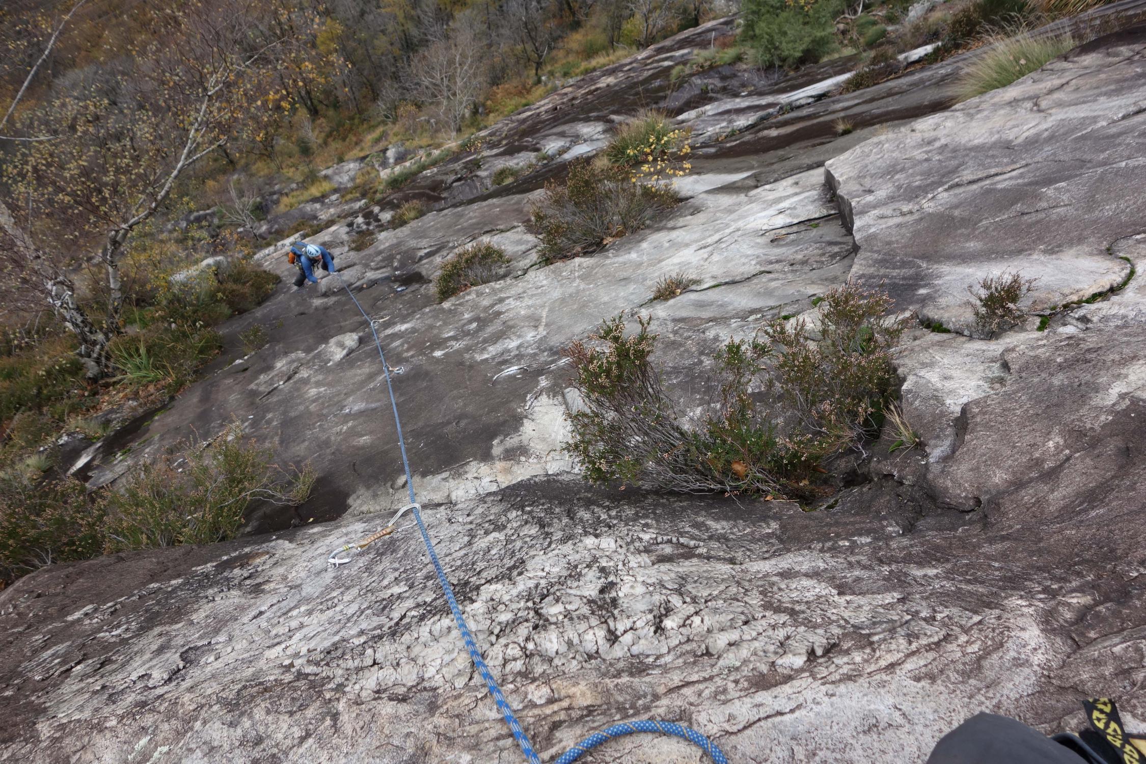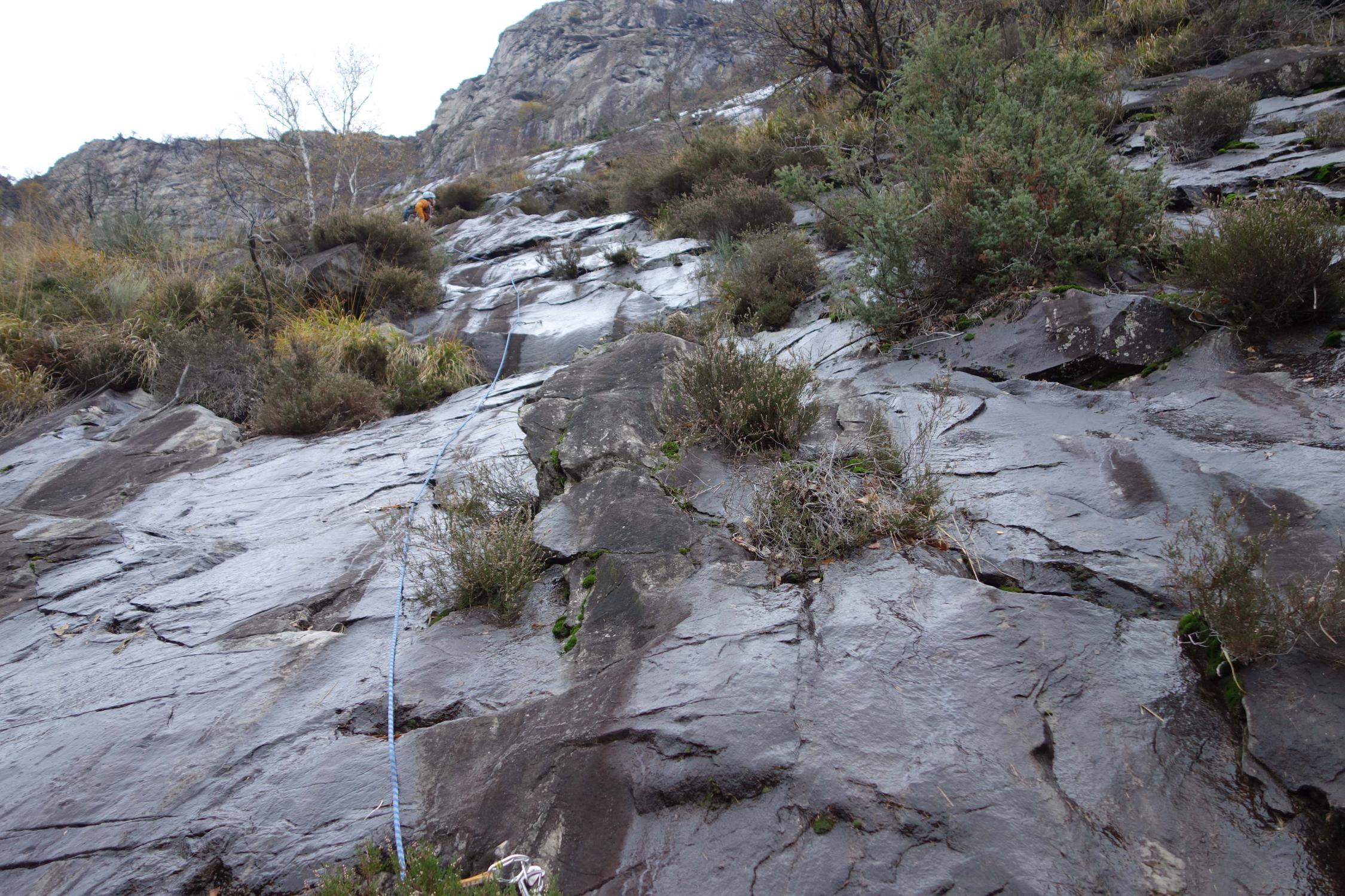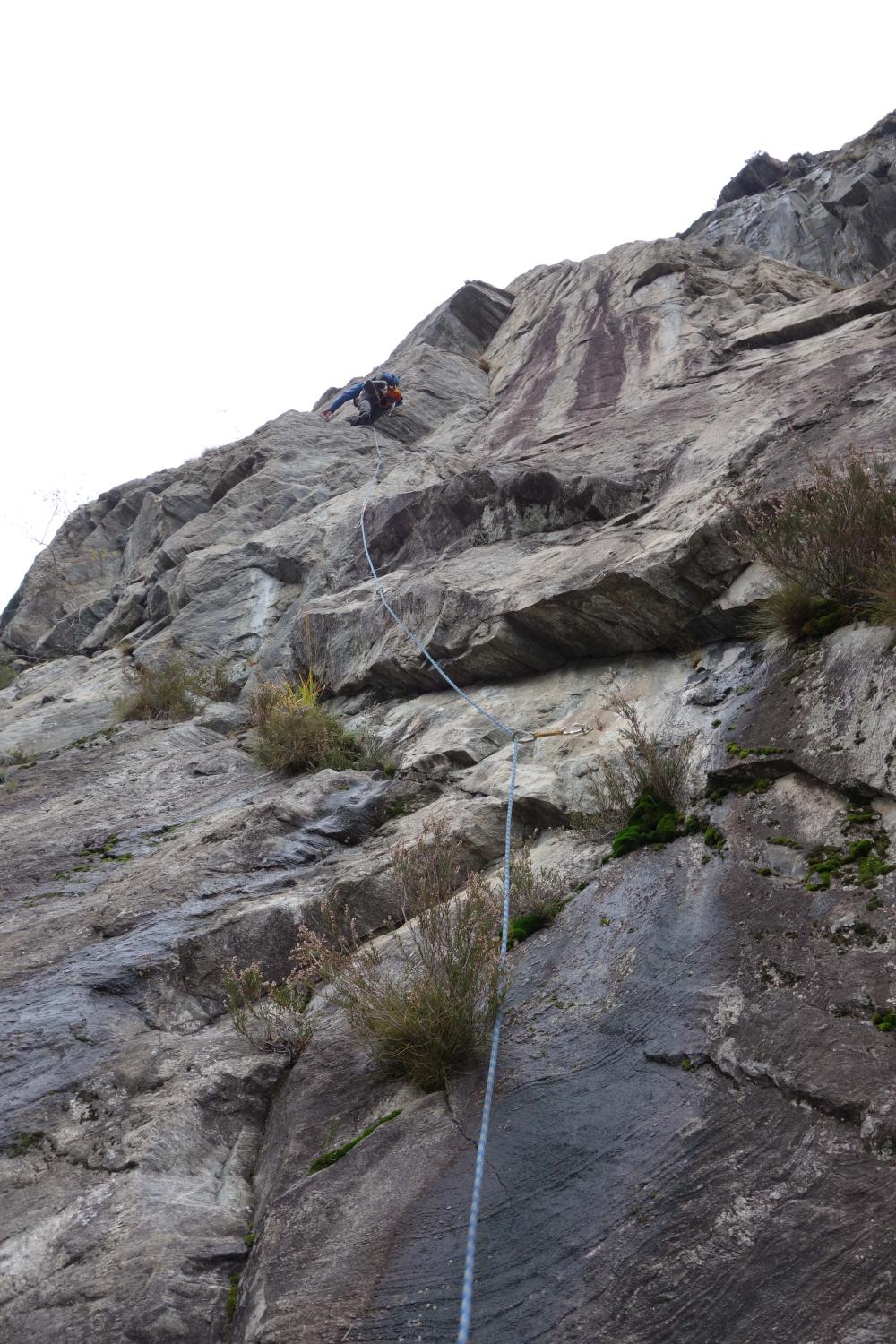 Die Alhambra ist zur Zeit in einem sehr feuchten Zustand und wird es wohl in absehbarer Zeit bleiben, es sei denn es kommt nochmals eine lange Trockenperiode und/oder längerandauernde Föhnlage im Tessin. Jede Seillänge war feucht, wobei die Situation in den unteren 11 Seillängen (bis zum Headwall) besonders prekär war. Der Headwall selbst ist trockener, abgesehen von der letzten Seillänge, die durchgehend nass ist. Durch die sehr gute Absicherung kann man sich aber wieder mal mit einem A0-Zug behelfen.