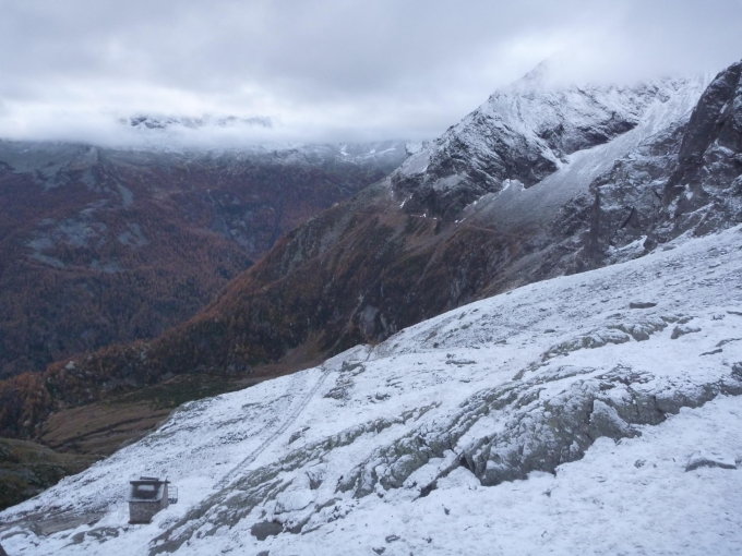 Der Weg zum Antronapass war trotz Schnee gut zu finden. Teilweise Schneeschauer. Ab dem Pass Schneesturm.