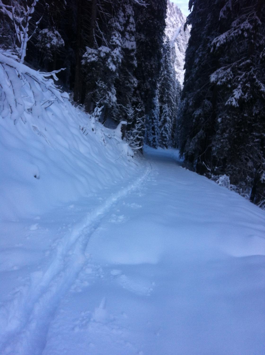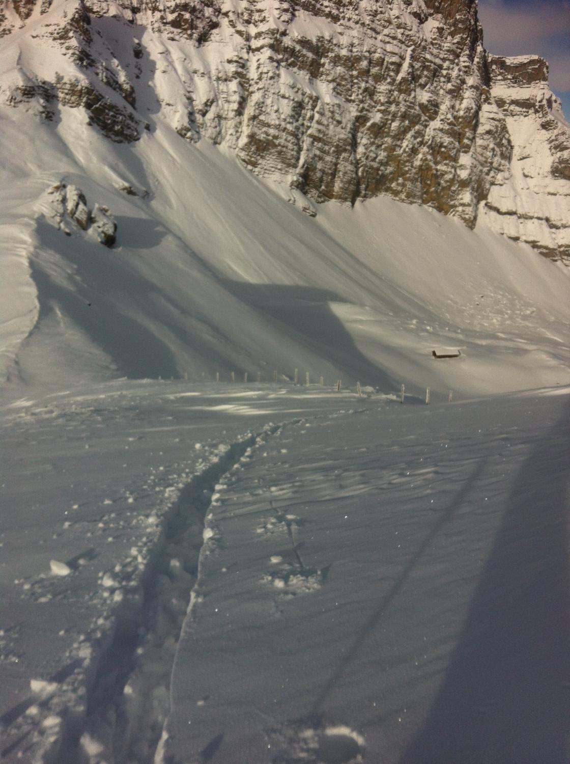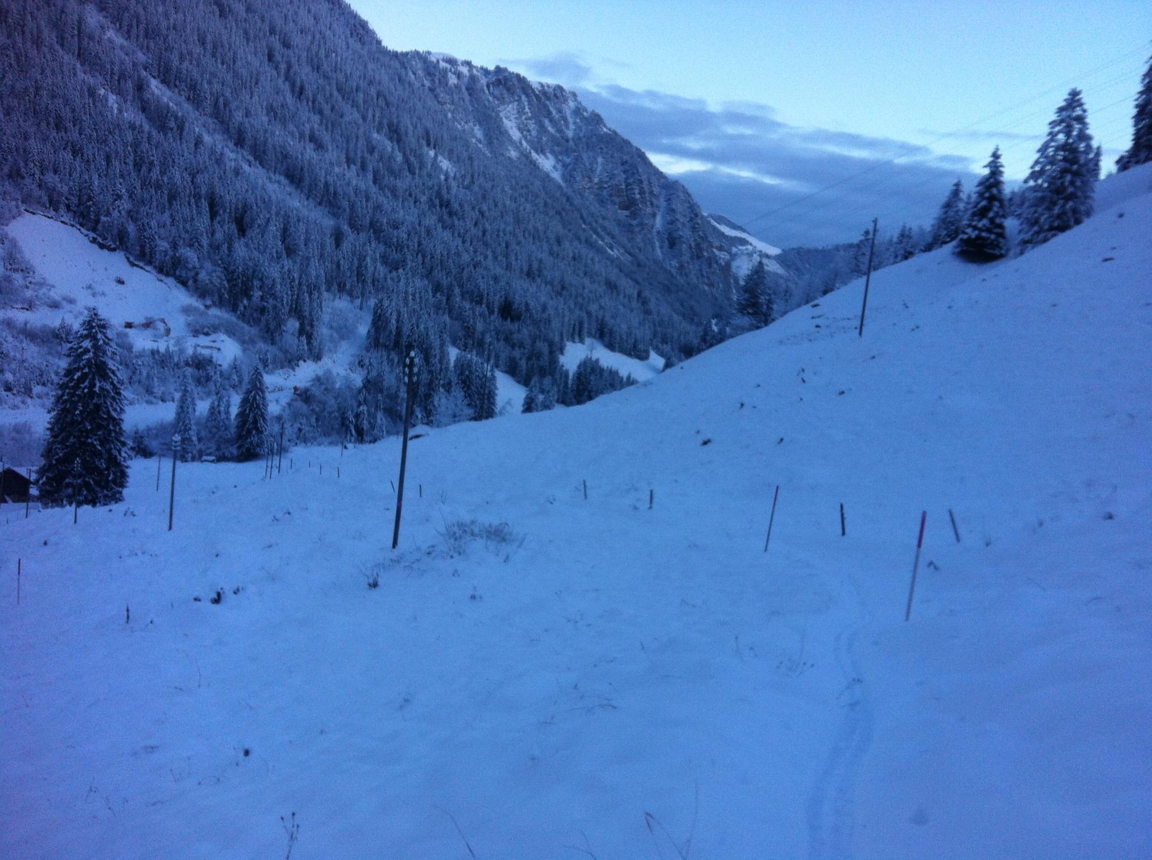 Waldweg optisch bereits gut eingeschneit...doch bei der abfahrt spürte man dich deutlich, dass es keine Unterlage hat. Treffer sind nicht zu vermeiden. Ab Grimmialp ca. 25-35cm Neuschnee. Die Spuren von gestern waren aber noch deutlich zu sehen.