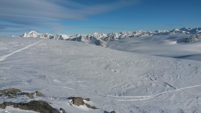 Ich bin zuerst in der Mitte beim Rest des Seracs hoch, dann am Ostrand der Wand abgefahren, nochmal auf der üblichen westlichen Route hoch und dann in der Mitte beim Serac wieder abgefahren. Für die Jahreszeit super, z.T. sogar mehr Schnee als im Mai. Schneequalität nicht immer gut, mal Pulver, mal Windharsch.