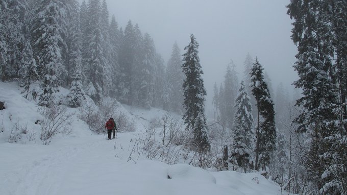 Wegen des Schneefalls und dem Nebel menschenleer. Traffen am Gipfel zwei Skitourengeher die sich ebenfalls vom Hudelwetter nicht abschrecken liessen.