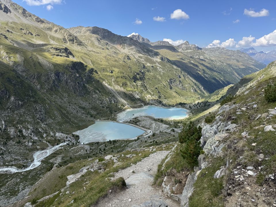Der Weg führt durch eine von Gletschern geprägte Landschaft. Zuerst geht man auf dem Rand einer Moräne, steigt dann über vom Eis geschliffene Steinplatten auf, hier sind die Steinmännli hilfreicher als die Markierung.