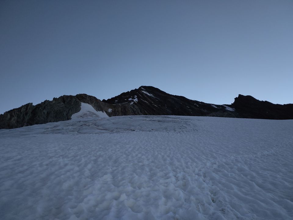 Orientierung im Dunkeln ist dank zahlreicher Reflektoren stark erleichtert. Der Gletscher ist gut begehbar. Nur eine kurze Passage mit Schnee im oberen Teil der Rippe, die bei Bedarf in den Felsen umgangen werden kann. Im oberen Teil hat es zahlreiche Sicherungsstangen. Lange aber sehr schöne Tour.