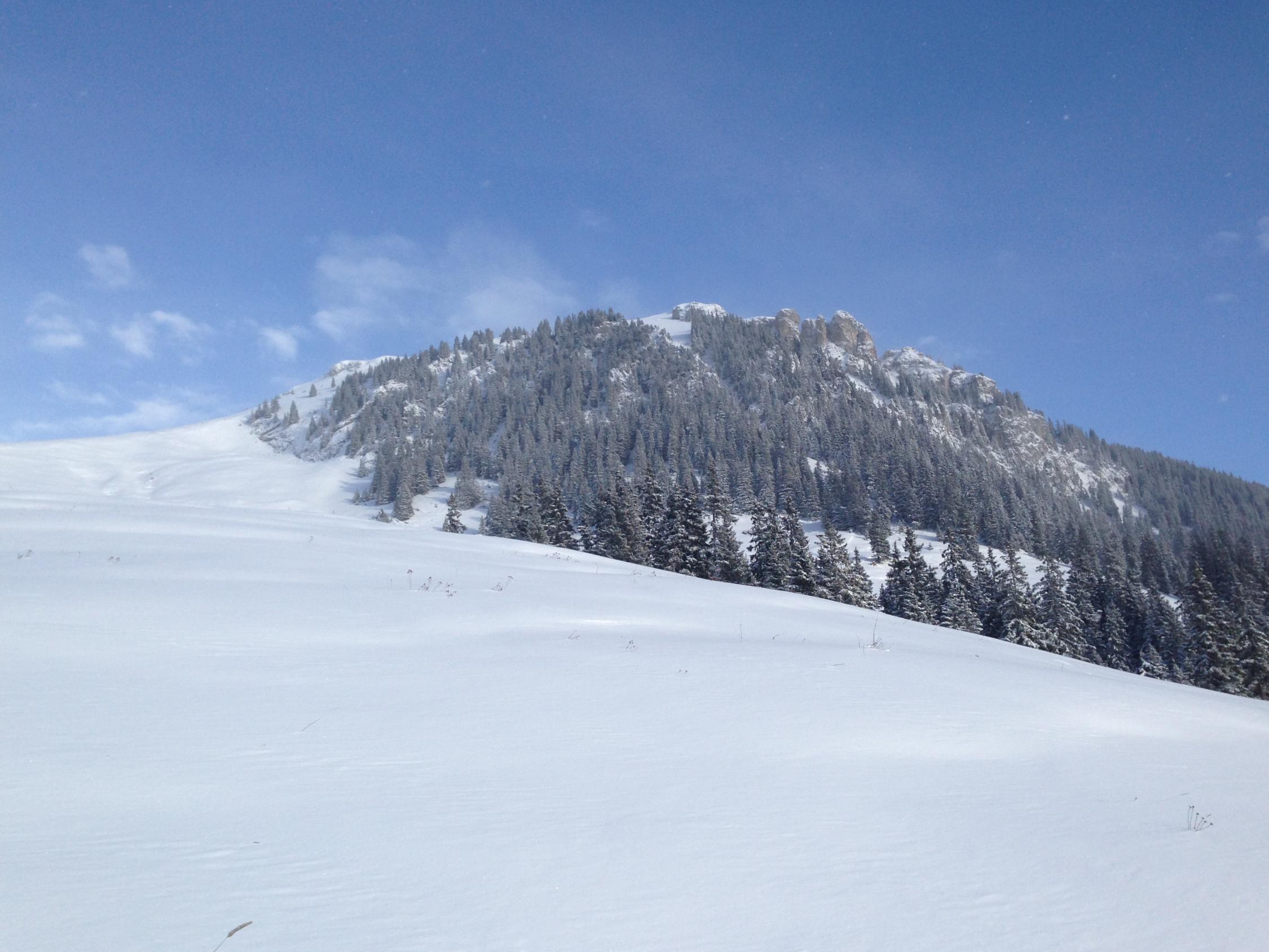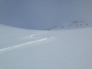 Der Gipfelhang ist mühsam da alle Löcher mit teifem Triebschnee gefüllt sind und daneben zum Teil die Weide hervorschaut.