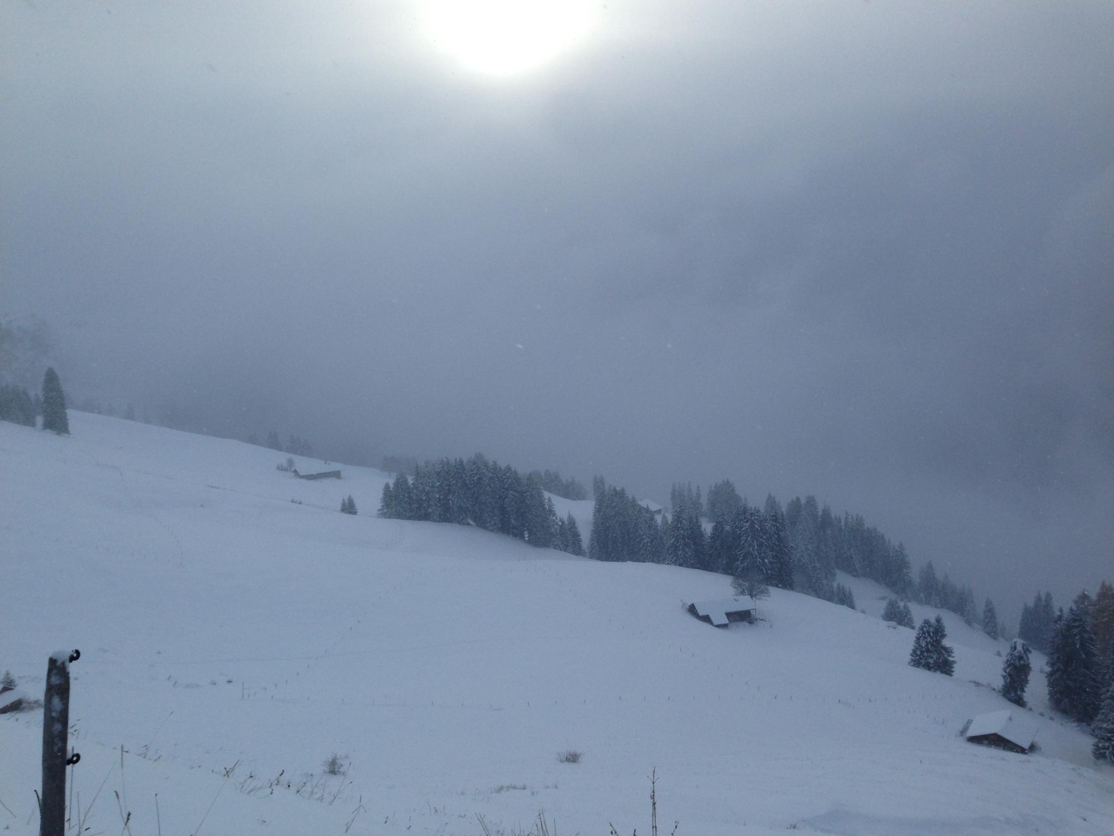 Heute winterliche Verhältnisse schon ab Konolfingen, die Strassen mehrheitlich schneebedeckt. Im Meniggrund 10cm Neuschnee, am Gipfel ein bisschen mehr, vielleicht knapp 20cm.