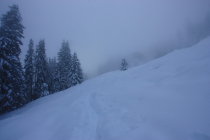 Etwa 40 cm Neuschnee. Start um 11:00 Uhr bei Nebel. Gute Spuranlage vorhanden. Ab etwa 14:00 Uhr Sonnenschein.