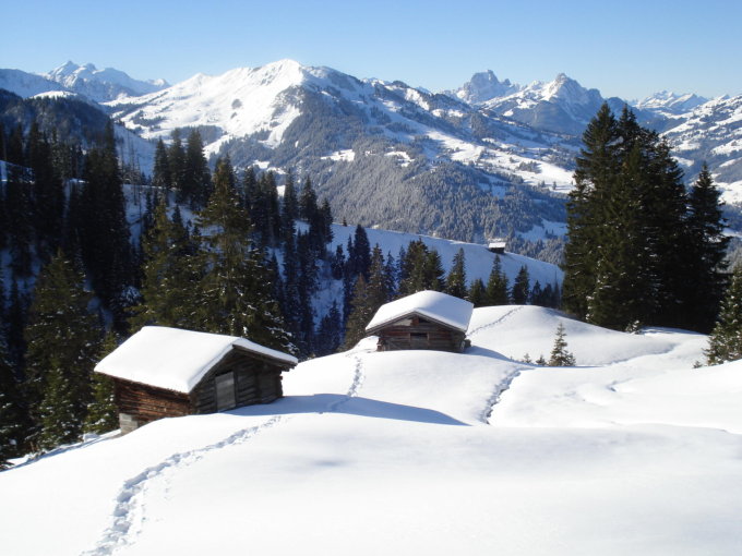 Simmentaler Seite: Schneeschuhe ab 1400m praktisch, darunter ca. 10cm Schnee. Gammerschal: Kammlagen z.T. bis aufs Gras abgeblasen, Mulden ca. 30 bis 40 cm Schnee, mit Triebschnee mehr.