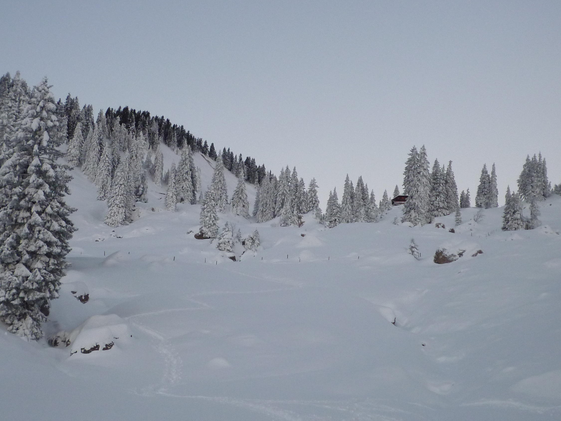 überraschender Weise sehr gute Verhältnisse ab Start im Eigenthal. Mehr als ausreichend Schnee den ganzen Aufstieg/Abfahrt, Traumlandschaft mit tief verschneiten Bäumen. Obersten 20m des Gipfelgrats eher abgeblasen. Abfahrt mit sehr viel locker Schnee und mit Unterlage.