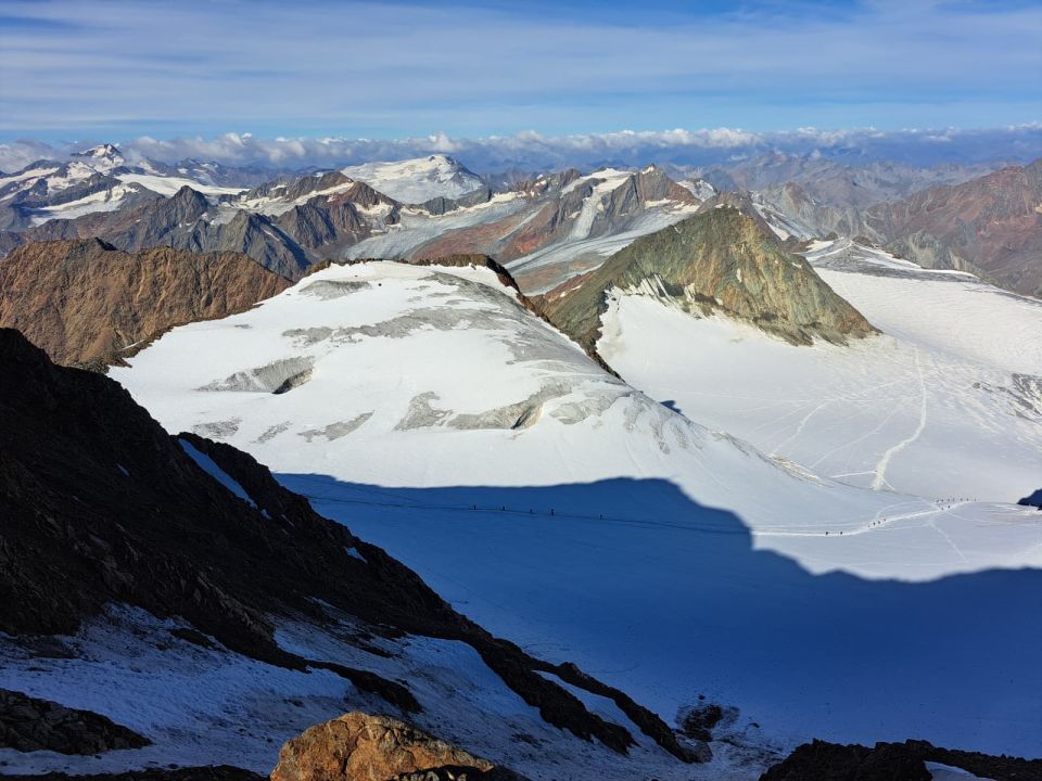 Am Dienstag super Verhältnisse, Rofenkarferner aper und Grat (noch) eine gute feste Spur (an ein, zwei Stellen kommt schon Eis hervor). Felsteil nach dem Rofenkarferner gut markiert, danach im Eis oder über schlimmen Bruch rechts hoch auf den Rücken unter P.3552. Am Jubiläumsgrat selber an zwei kürzeren Stellen und vom Nord- zum Südgipfel Felskontakt. Schnee im Abstieg über den Jubiläumsgrat um halb zehn schon recht weich.