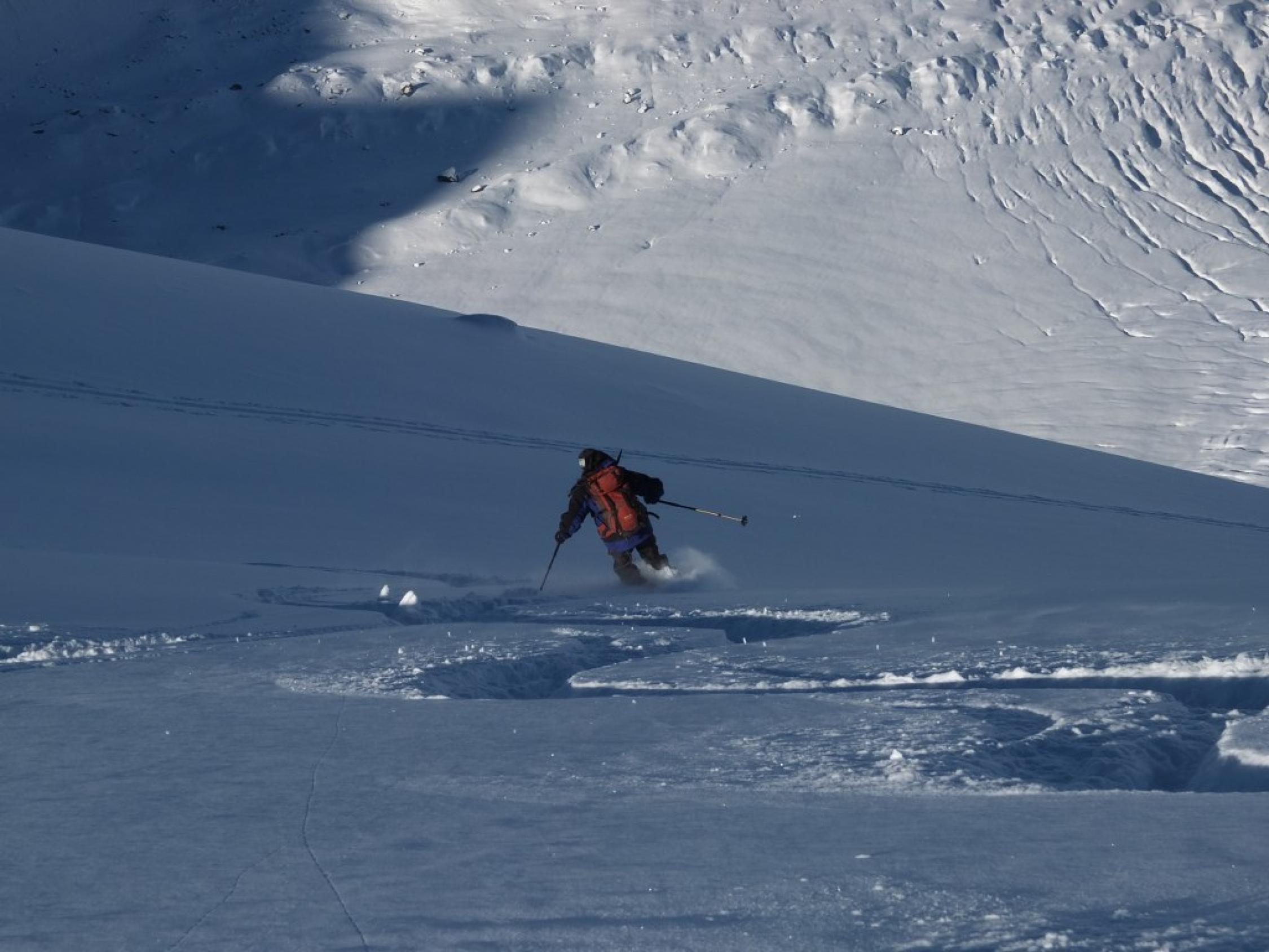 Triebschnee kleine Rutsche ausgelöst in Abfahrt von Isla Persa auf Morteratsch Gletscher