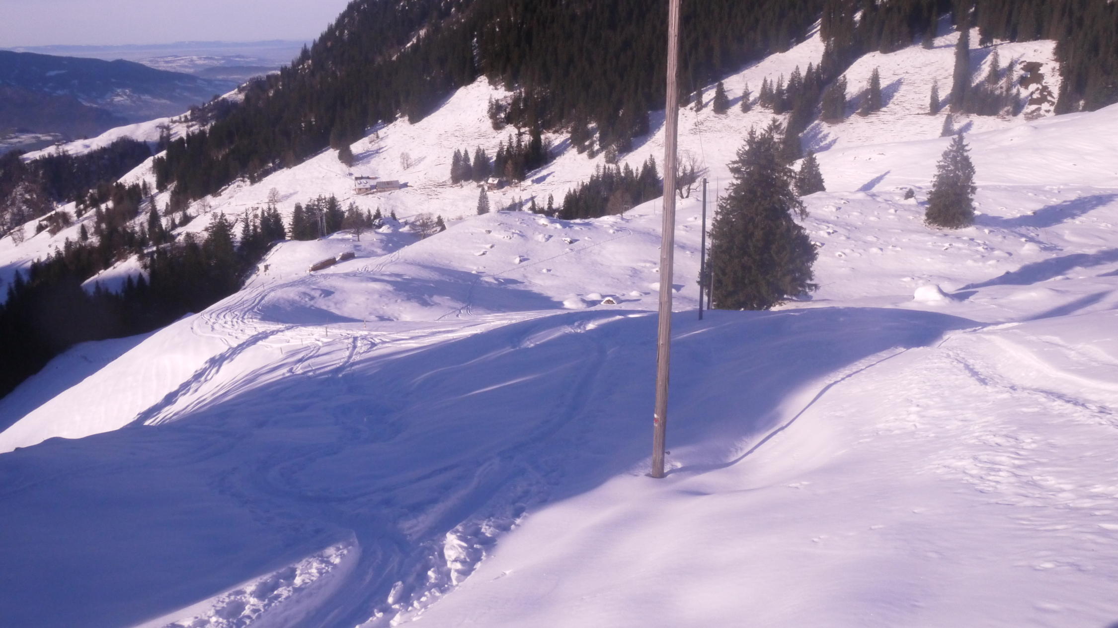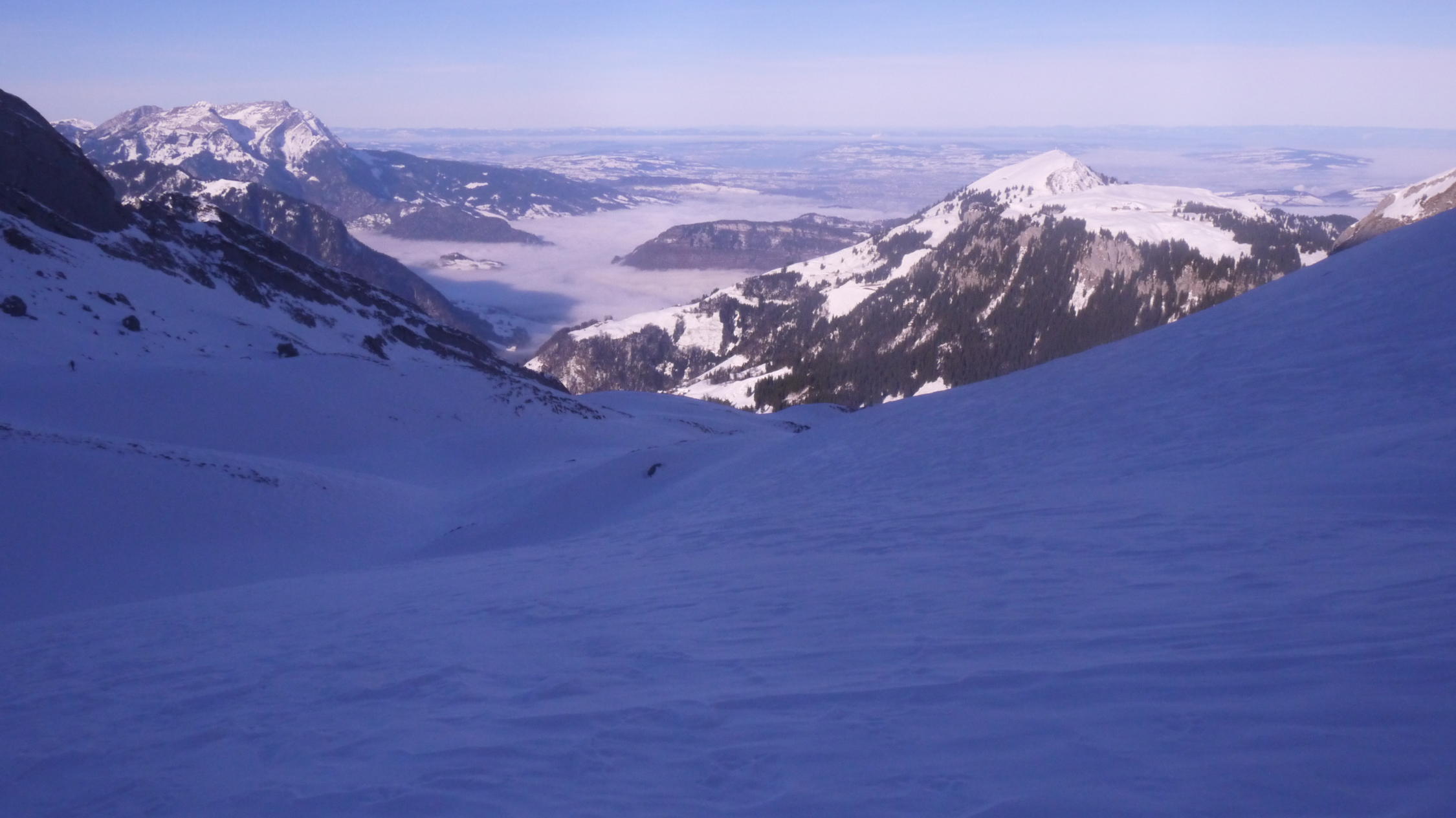 Teils Pulverschnee, viel unterschiedlicher Winddeckel, Ab Chrüzhütte schöne Pulverschneehänge, vor Niederrickenbach durch Sonneneinstrahlung bereits angesulzt.