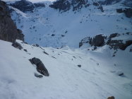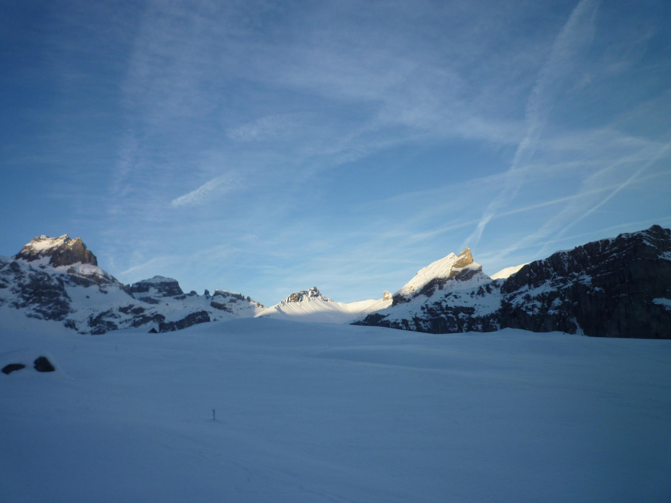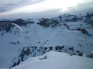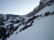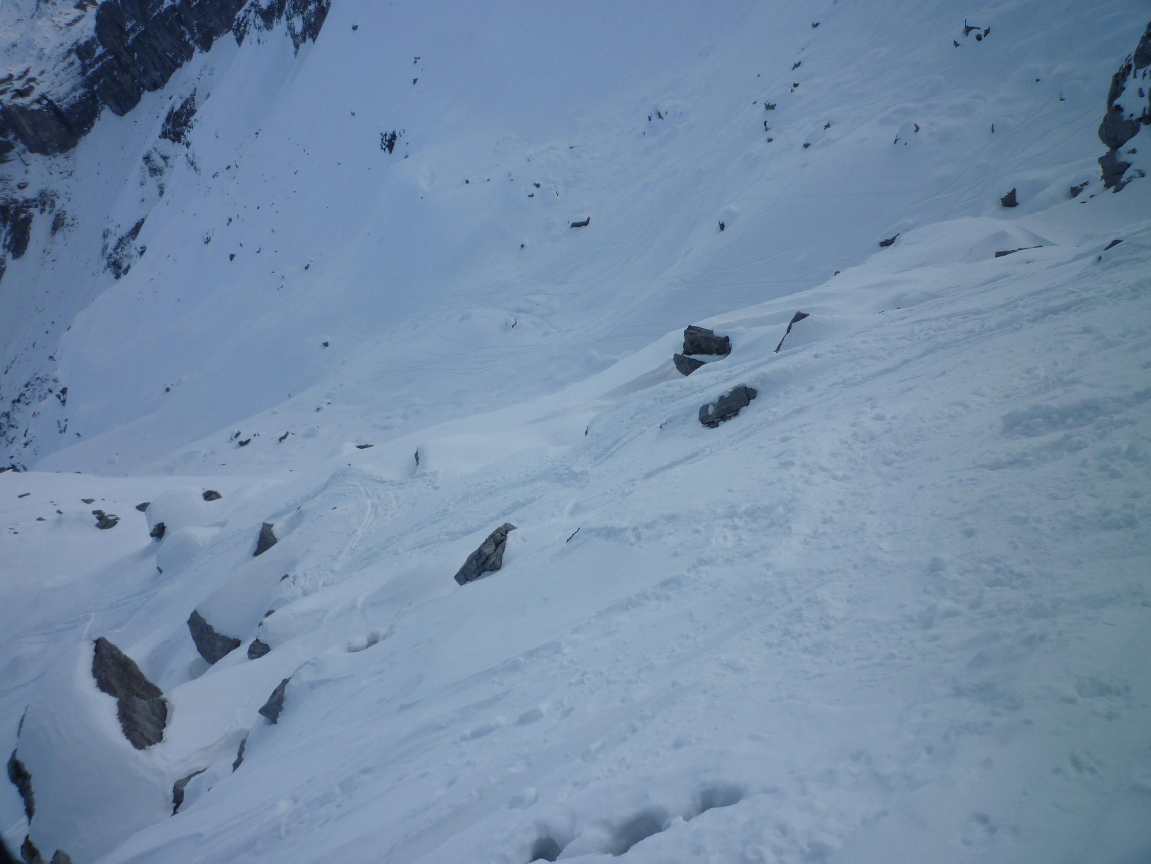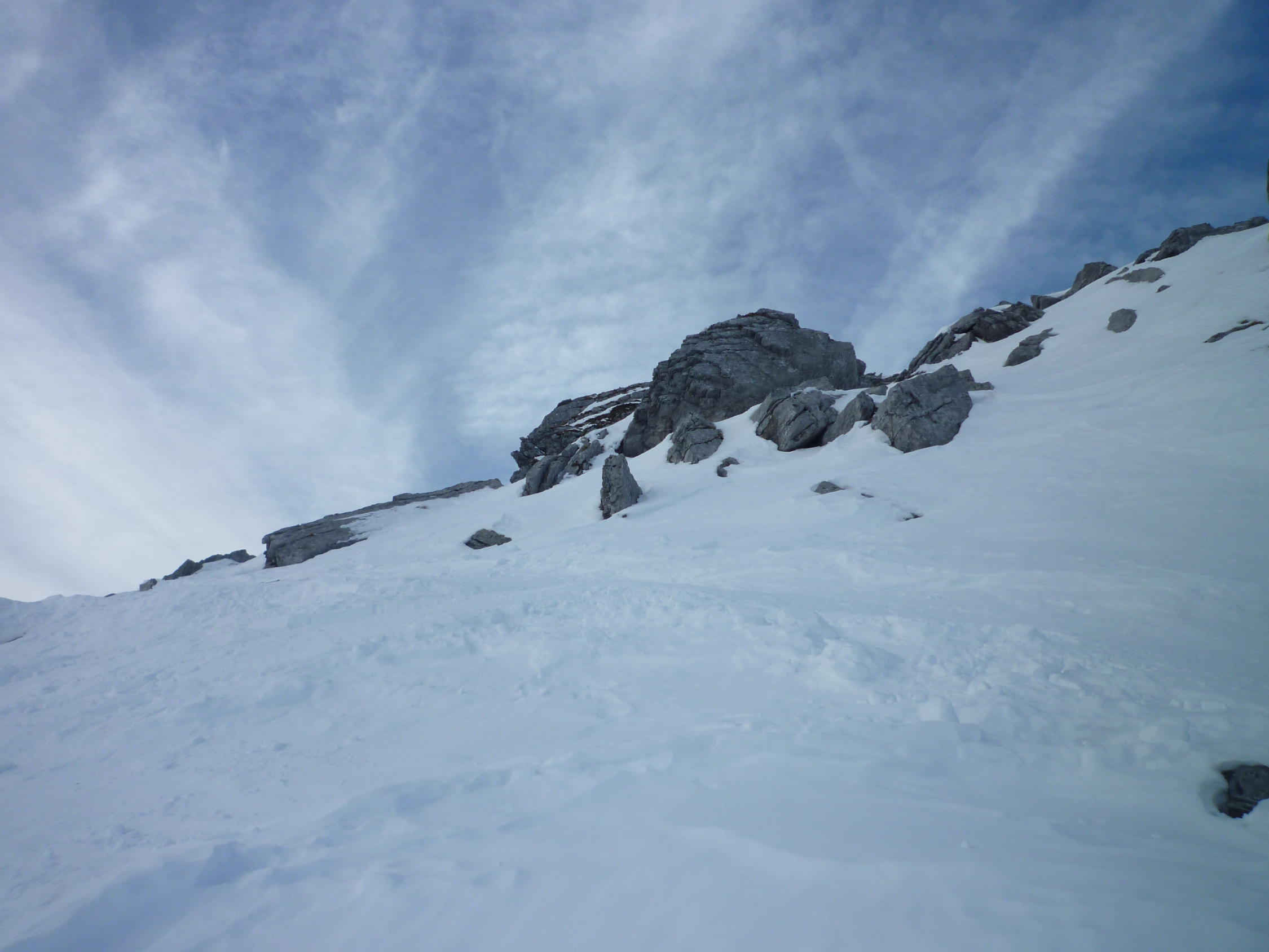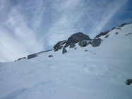 Lediglich der Gipfelhang hat noch ein paar Steinige Slalomstangen. Schneebeschaffenheit mehrheitlich Locker Schnee, ganz wenige Stellen mit leichtem Deckel.