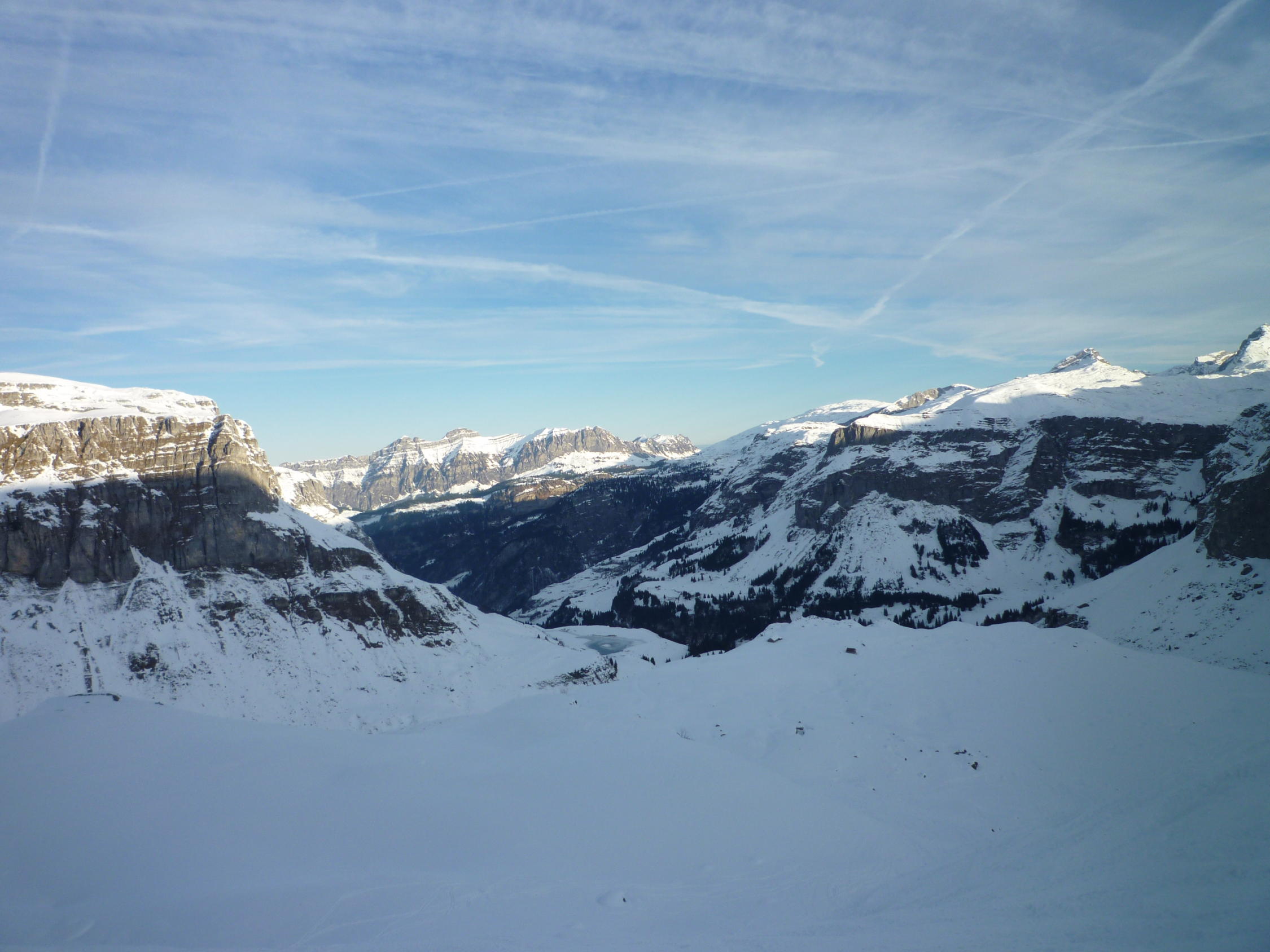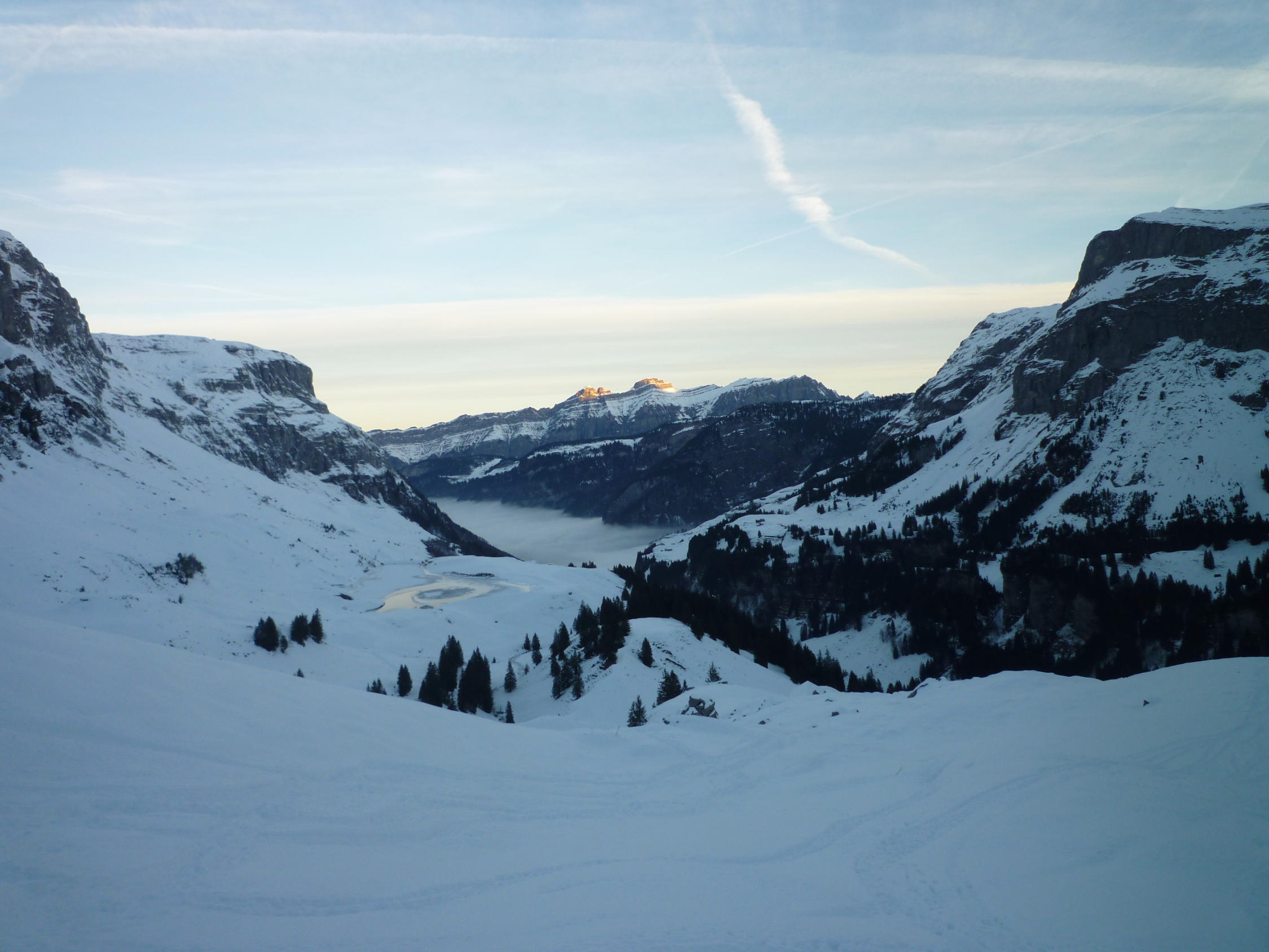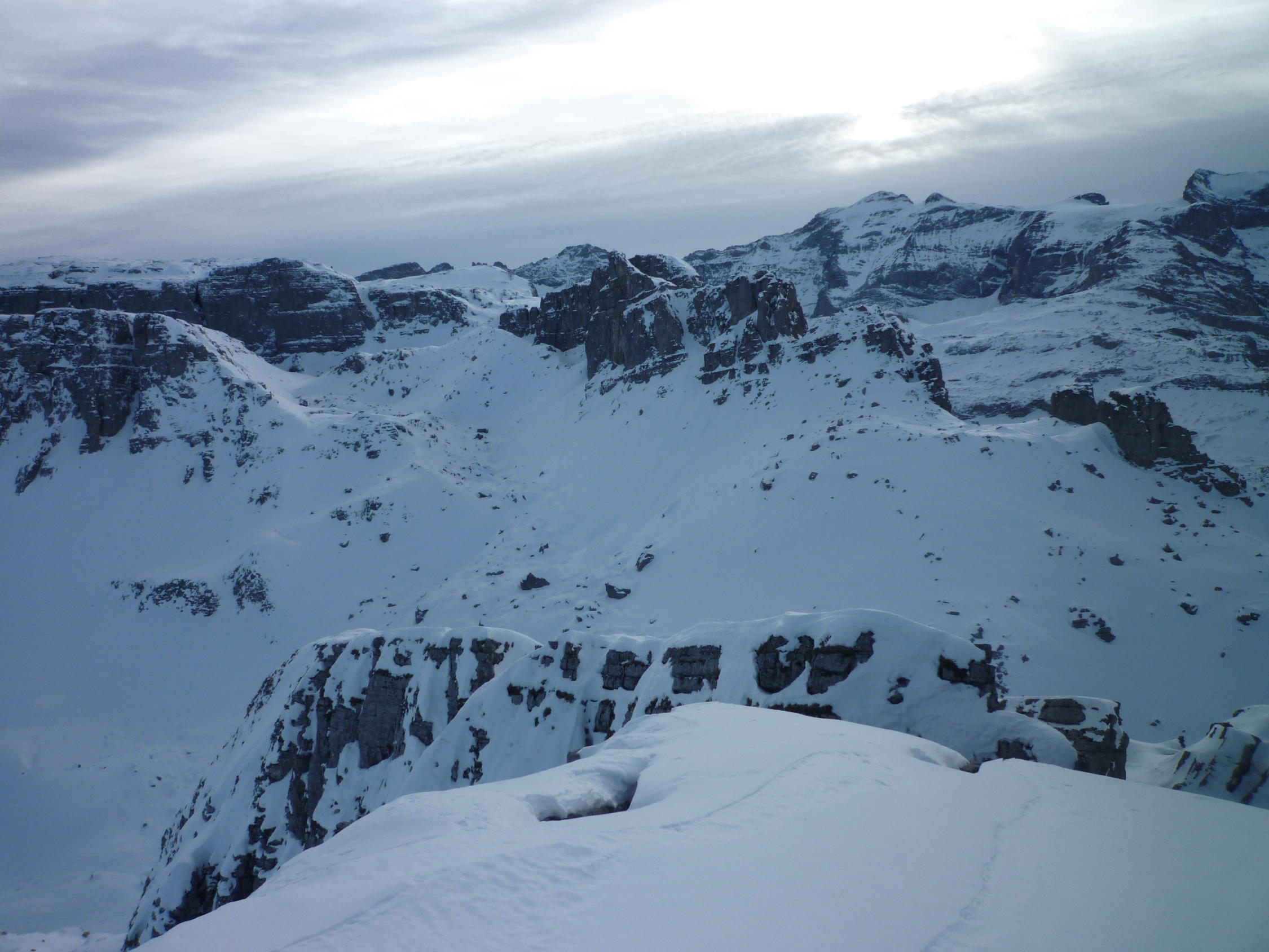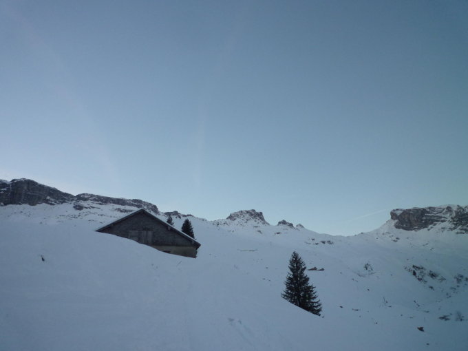 Lediglich der Gipfelhang hat noch ein paar Steinige Slalomstangen. Schneebeschaffenheit mehrheitlich Locker Schnee, ganz wenige Stellen mit leichtem Deckel.