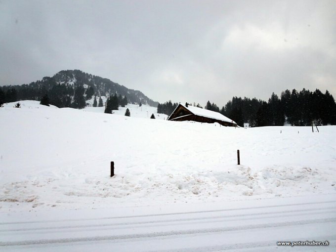 Neblig, Schneefall, stürmischer Wind und mässige Sicht, vor allem bei der Abfahrt.