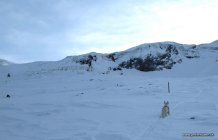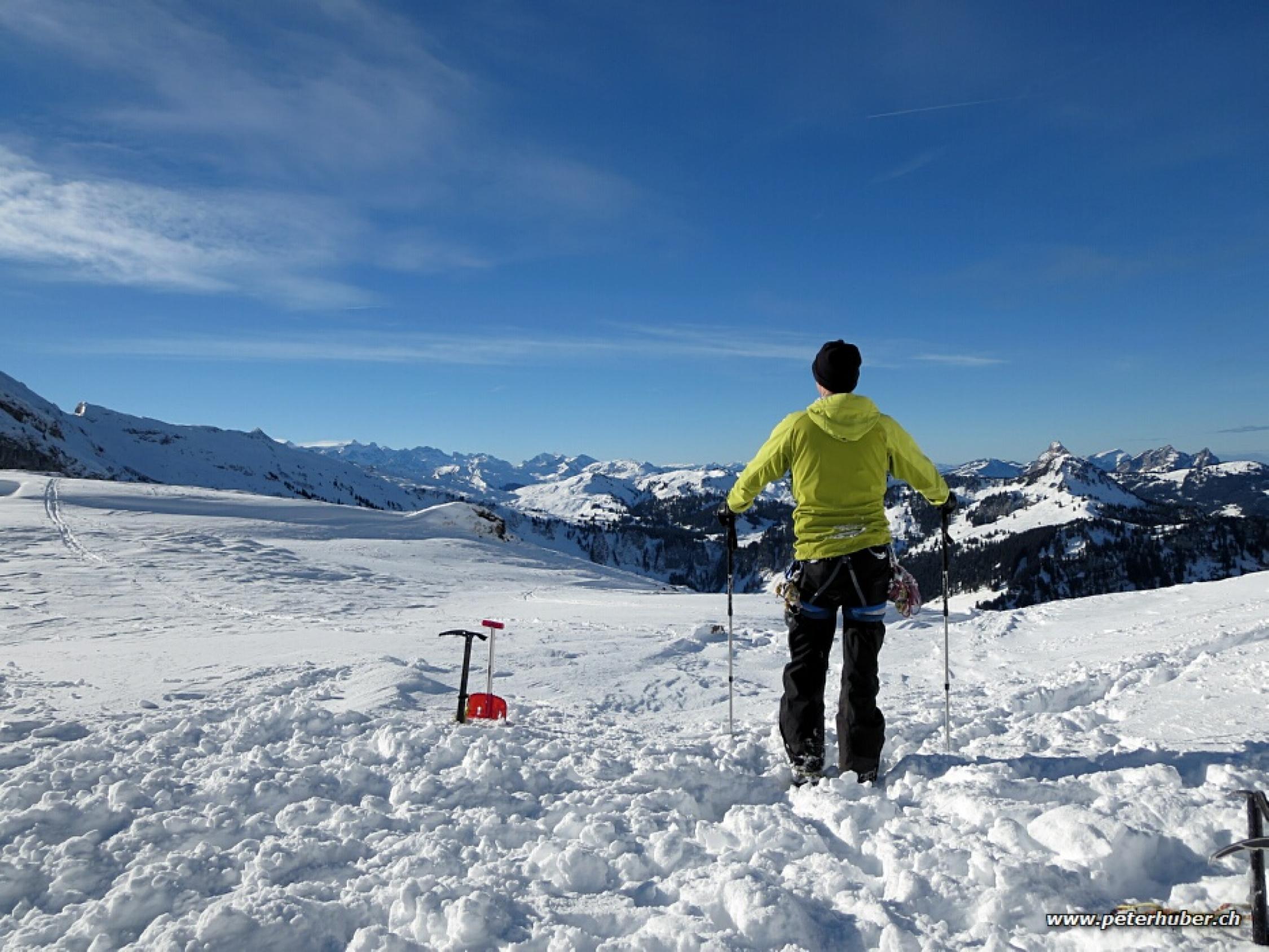 Da die Steilstufe bei 1900 m sehr verweht aussah, für den Aufstieg reicht es, jedoch für die Abfahrt war kein Vergnügen absehbar, haben wir unsere Tour im Sattel südöstlich des Pfannenstöcklis beendet.