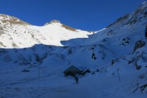 Sulz, Hartschnee und Pulver, nicht mehr durchgehend Schnee bis zu Skidepot. Steinfreie Abfahrt bei Benützung der verschneiten Fahrstrasse ab Oberalpiglen.