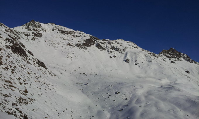 Skitürler tragen die Skis beim Start kurz, nach der Skihütte Stäfeli bietet die Routenvariante 506a durch die Mulde östlich vom Grat mehr Schnee (siehe Foto).