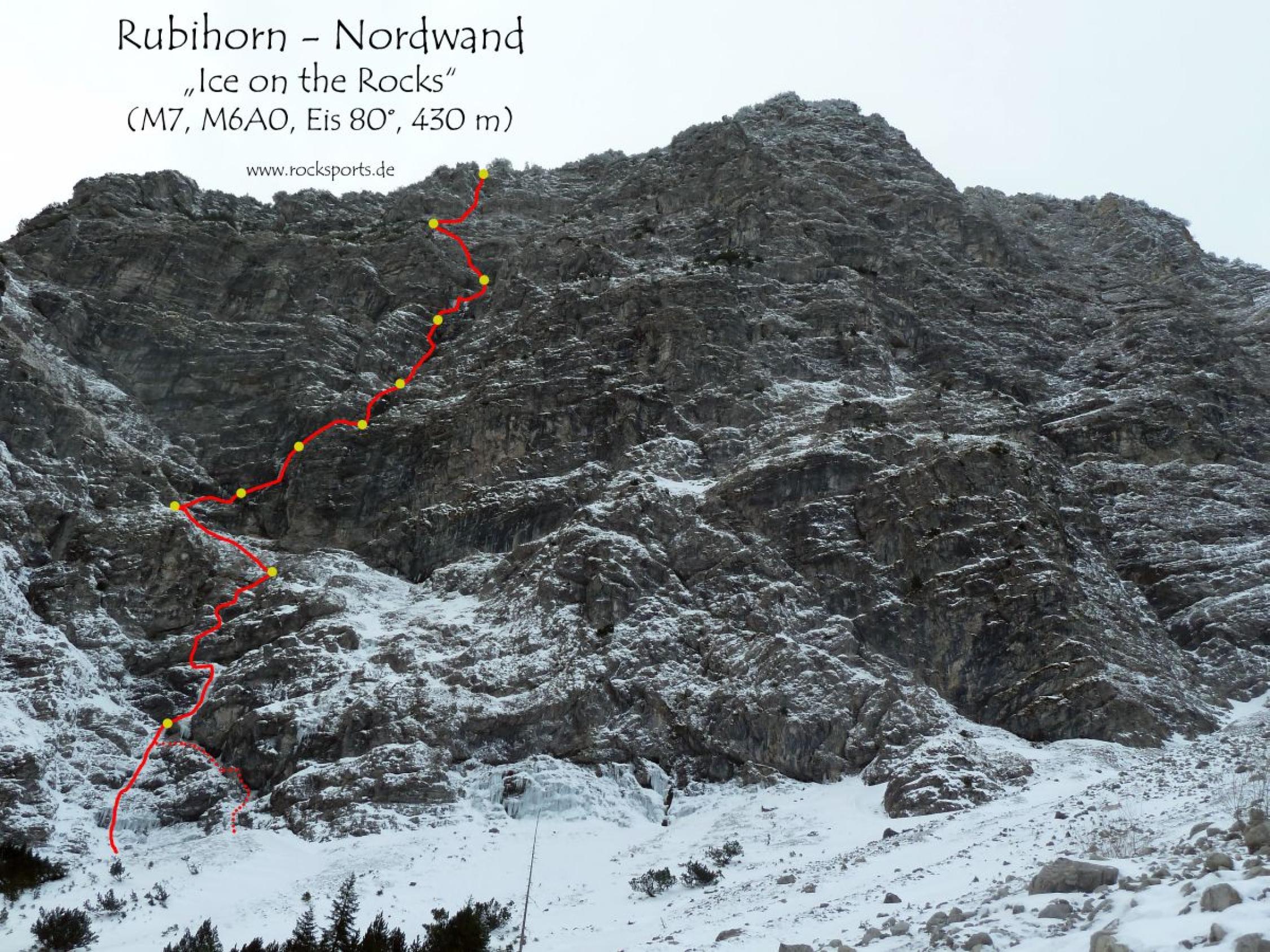 Mit der Tour „Ice on the Rocks“ in der Rubihorn Nordwand ist Walter Hölzler ein absolutes Highlight unter den alpinen Allgäuer Mixed-Climbs gelungen. In bestechend alpiner Linienführung und reich an markanten Passagen führt sie über 11 Seillängen begeisternd nach oben. Gleich mehrere Seillängen dürften zu den schönsten Seillängen am ganzen Rubihorn zählen. Der Fels ist für Rubihorn Verhältnisse meistens richtig gut.