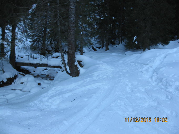 Gemessen an den meteorologischen Verhältnissen herrschen noch gute Tourenbedingungen. Feiner Flugschnee auf der harten Spur bedingen stellenweise Harscheisen oder intakte Felle.
