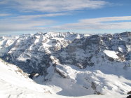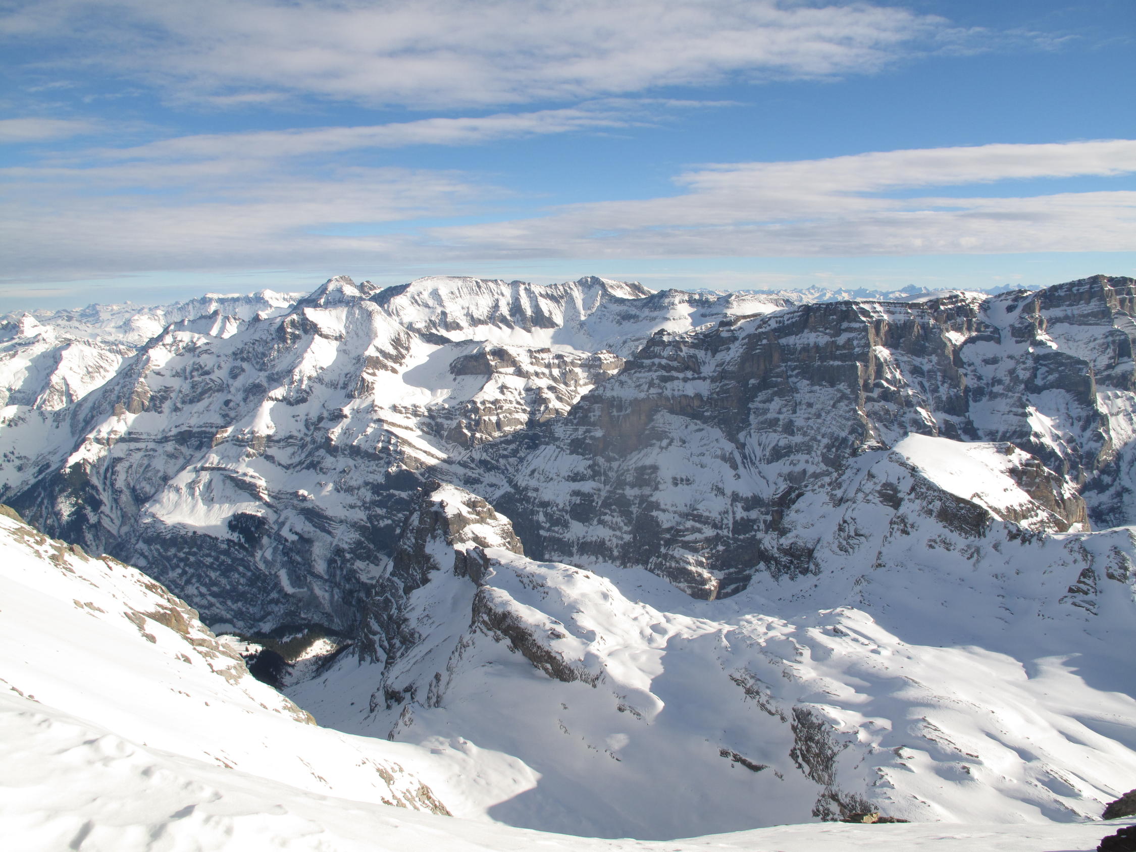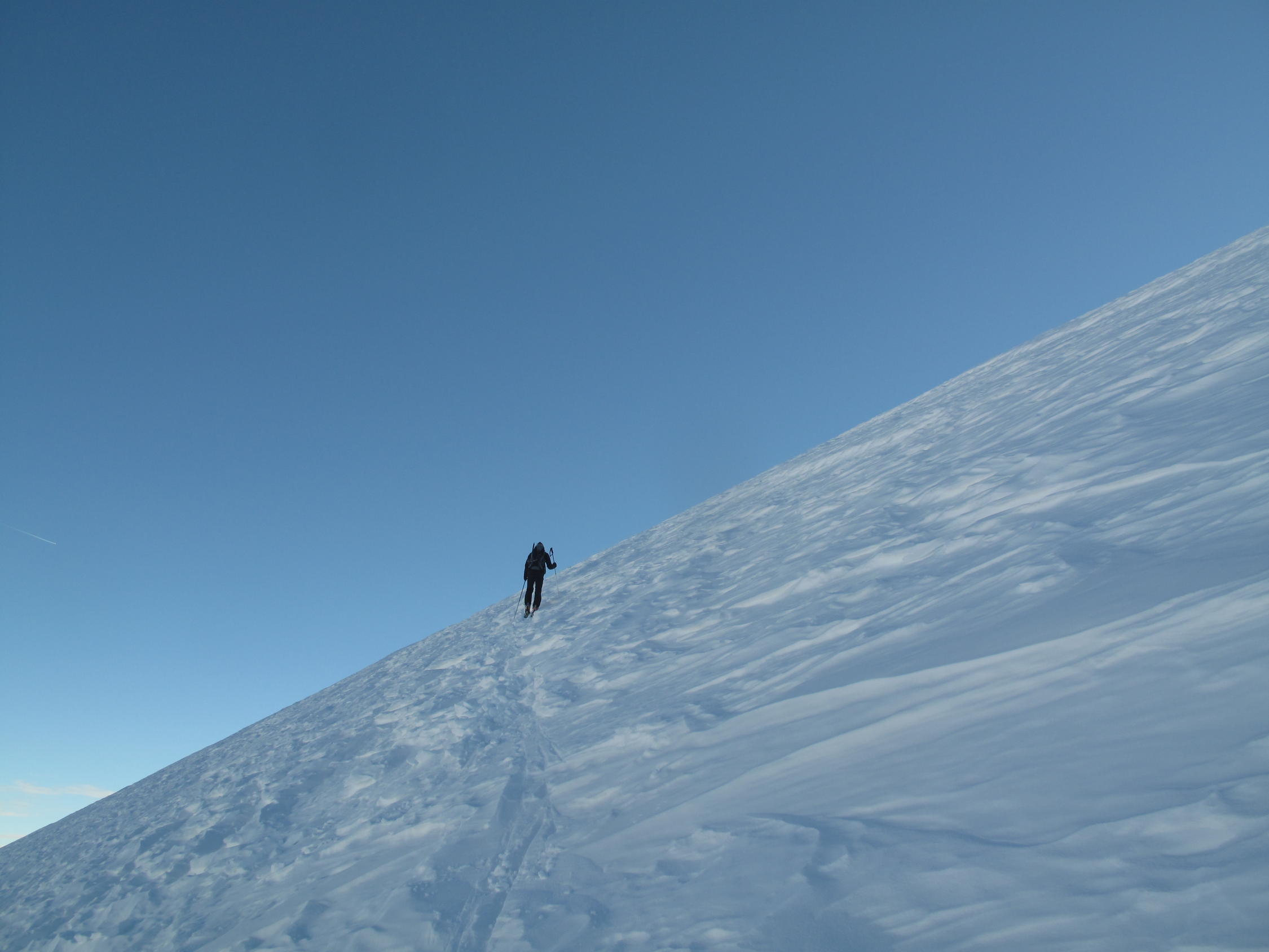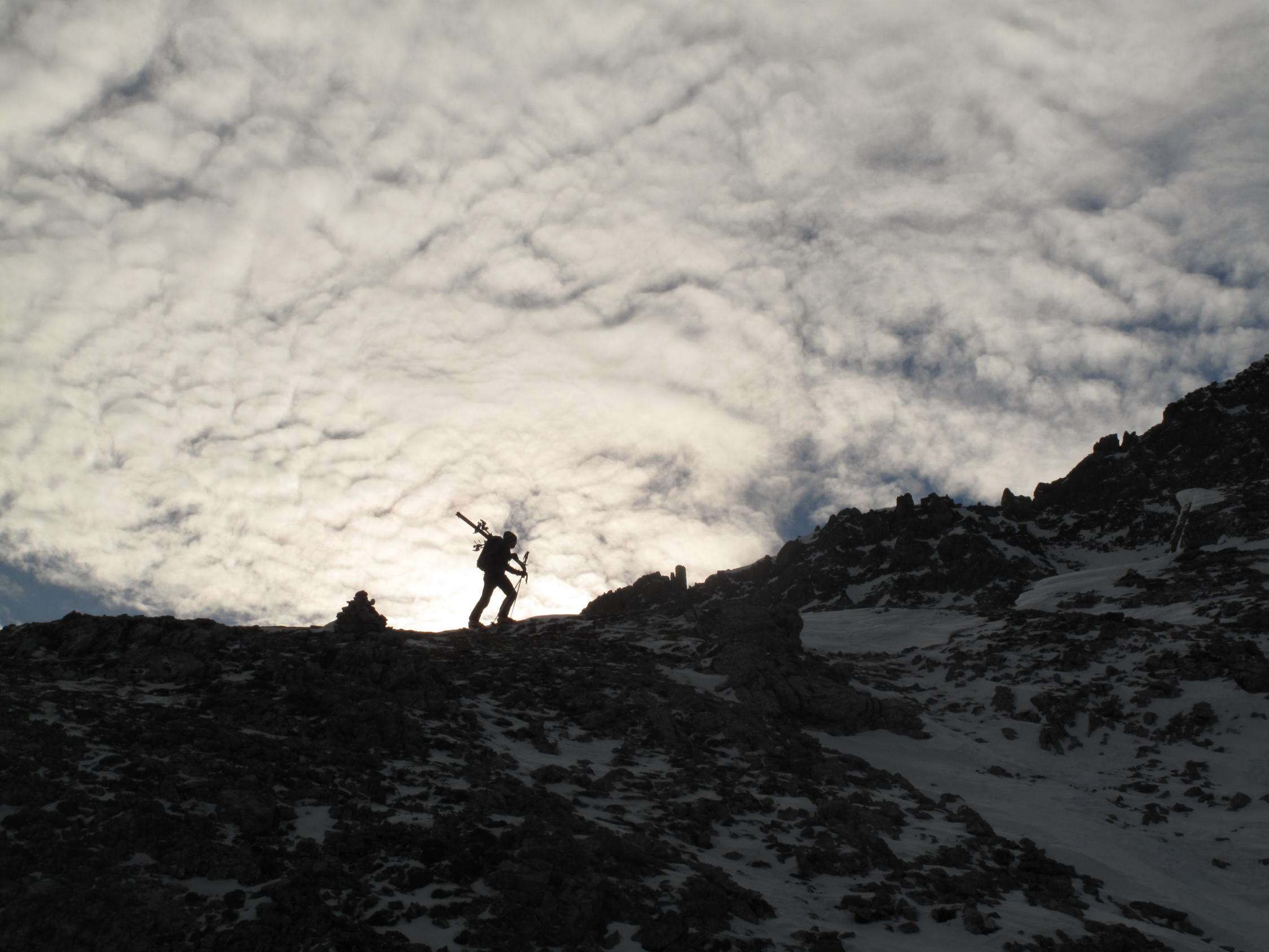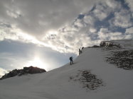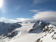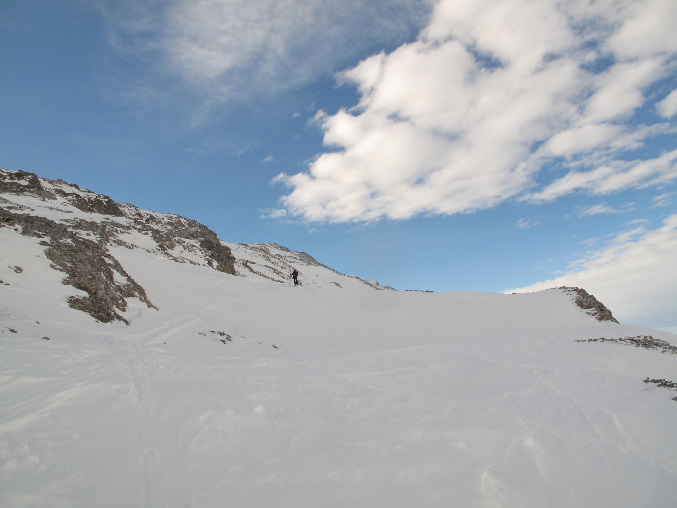 Die Seilbahn Angestellte empfing uns mit den Worten: "Na hoffentlich habt ihr eure alten Ski mitgebracht..." Und so war es dann auch: Abgeblasen! Den Übergang bei ca 2520m haben wir verpasst. Weiter rechts konnten wir in kurzer Kletterei mit aufgebundenen Ski`s die Felsbarriere problemlos überwinden. Weiter oben hatte es mehr Schnee. Zuerst sehr hart. Der Lang Firn ist gut eingeschneit. Die Abfahrtsfreuden hielten sich erwartungsgemäss in Grenzen bzw. fanden gar nicht statt. Ab Felsbarriere/Übergang, der bei der Abfahrt leicht zu finden war (und fahrbar), z.T. etwas mühsame Routenfindung. Es gab ja Schnee, nur nicht dort wo wir ihn gerne gehabt hätten :-)
