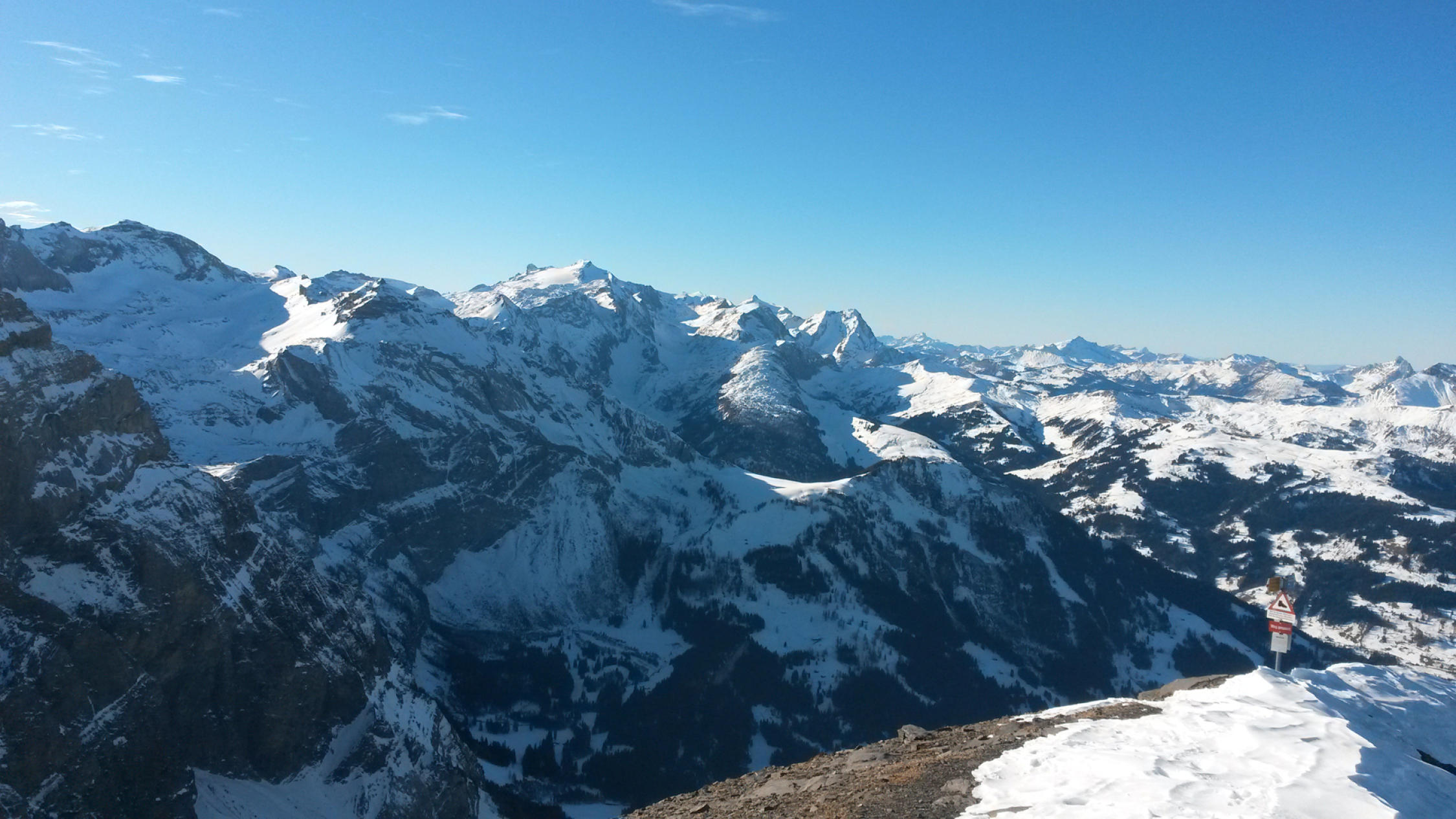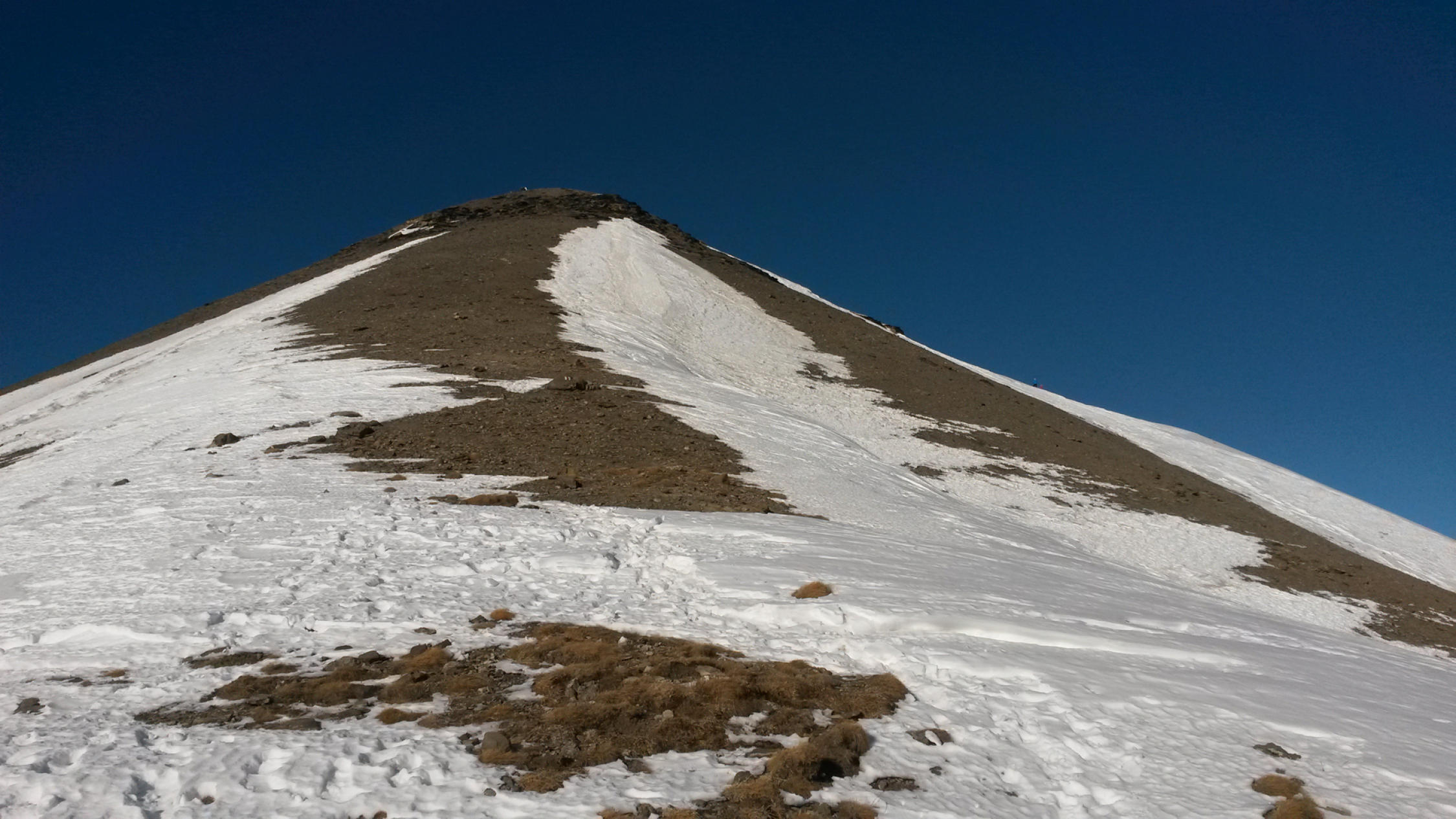 Trotz des schönen Wetters war heute kaum etwas los am Gipfel. Wegen zu wenig Schnee konnten wir nicht direkt vom Gipfel abfahren (s. Fotos).