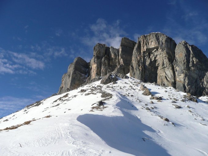 Pulverartig bis zum Ruosalper Chulm. Weniger, und überwiegend harter bis glasiger Schnee bis zum Couloir. Couloir nicht voll -> Felsbariere. Kann links oder rechts umklettert werden. Rechts ist oberhlab ein Bohrhaken. Schnee im Couloir nach Sonneneinstrahlung weich. Liegt aber auf knallhartem Untergrund, und man rutscht auf mal weg... Pickel notwendig! Steigeisen hilfreich.