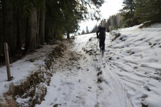 Vom Start weg durch den Wald sehr dürftige Schneeverhältnisse. Im oberen Bereich nordseitig erstaunlich gut.