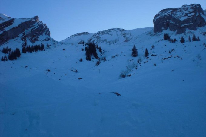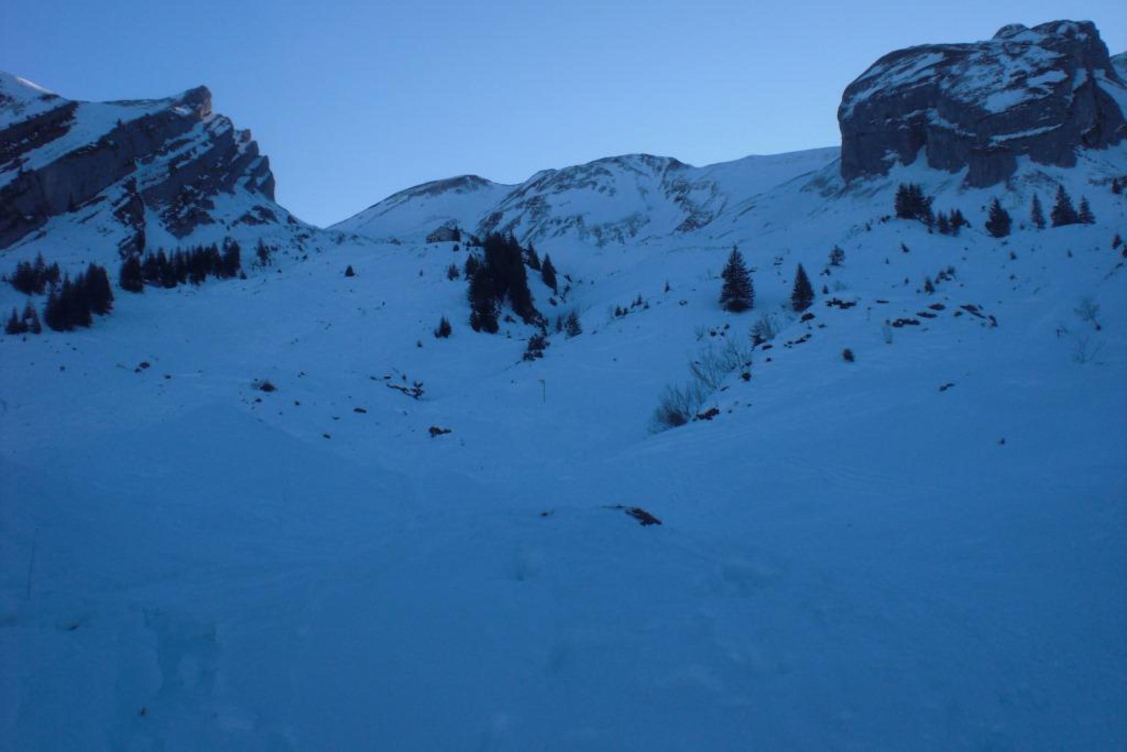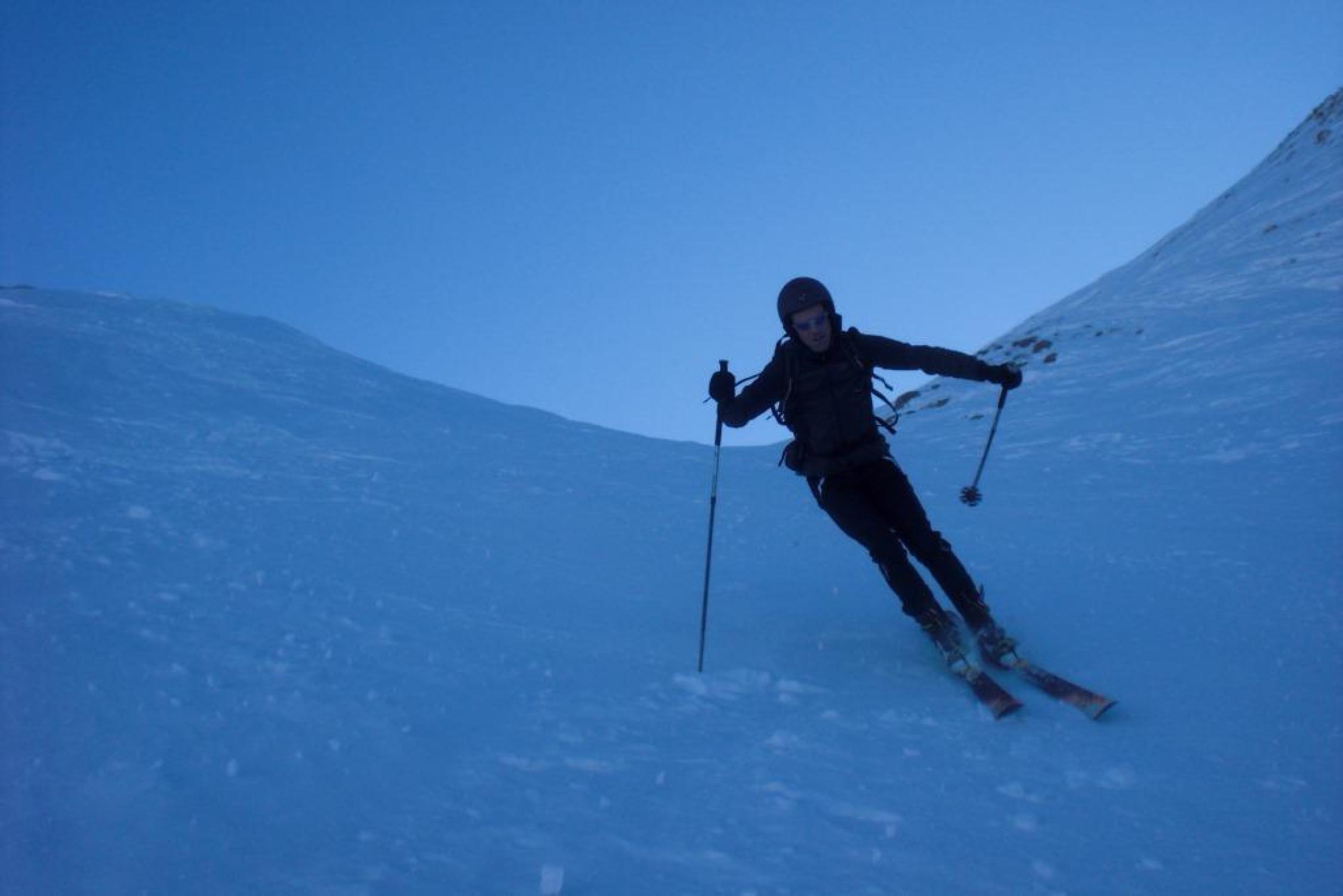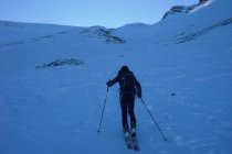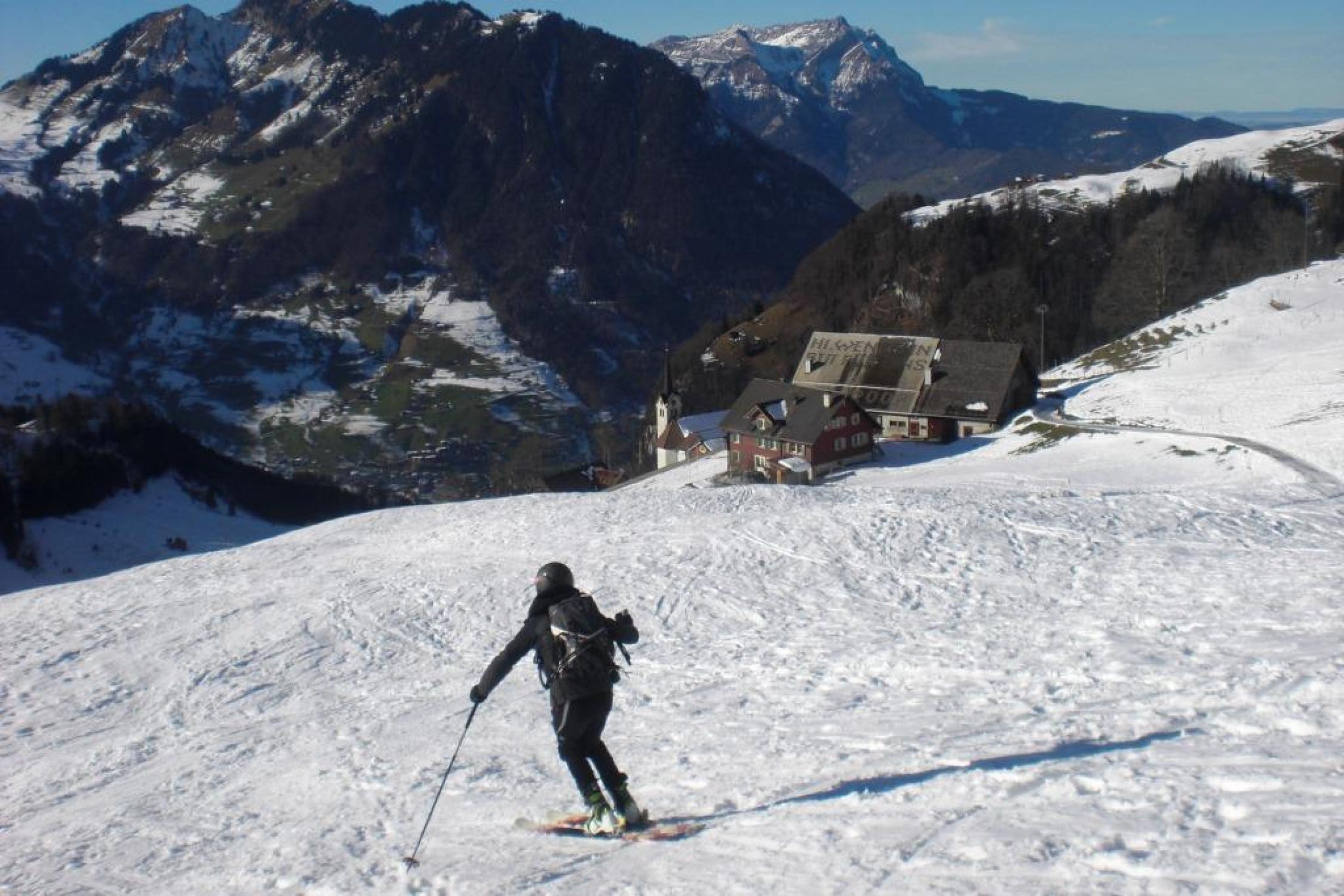 Abfahrt je nach Variante, entweder Nähe der Aufstiegsspur oder mehr rechts. Risetenstock über die schönen Hänge gegen das Brisenhuis hinunter. Ab hier wieder der Aufstiegsroute folgend nach Niederrickenbach.