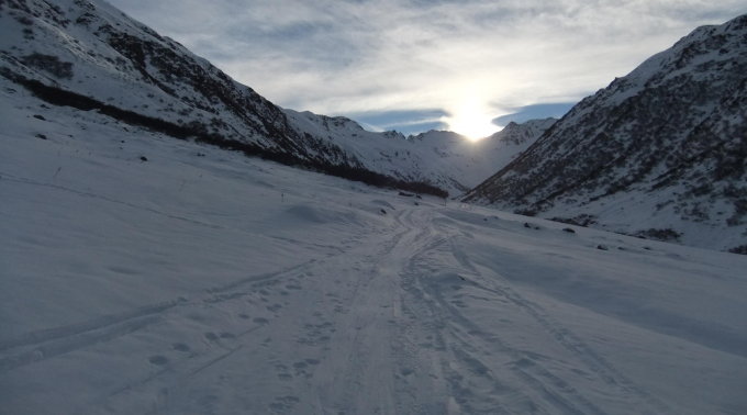 Die zu querenden Hänge sind südwestseitig ausgerichtet. Bei verfestigtem Schnee ist es zweckmäßig, Steigeisen mitzuführen. Bei den Hangneigungen sollten unbedingt die Lawinenwarndienste beachtet werden. Heute war lediglich Stufe 1.