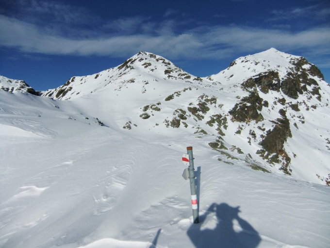 Lediglich 2 Skitouren-Fahrer gesehen, die vom Matschuner Joch kamen und ins Vergaldner Tal hinab kreuzten.