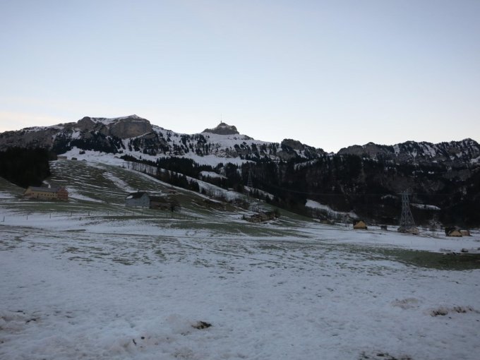 Start um 8:00 bei schönem Winterwetter und -4°C. Viel Grün neben dem Weiss, aber von Brülisau bis Ruhesitz gut tragende, mit Pistenfahrzeug präparierte Spur. Ab dem Ruhesitz etwas mehr Schnee und Schneedecke mit zunehmender Höhe weniger bis gar nicht mehr tragend. Die letzten ca. 100 – 150 hMt. unter dem Kastensattel teilweise sogar 60 – 70 cm eingesunken. Schnee wurde durch Föhsturm in die Nordflanke eingeblasen. Aufstieg über Chatzetöpli sowie auch der Schlussaufstieg zum Drehrestaurant haben wenig Schnee…