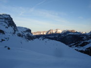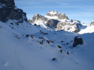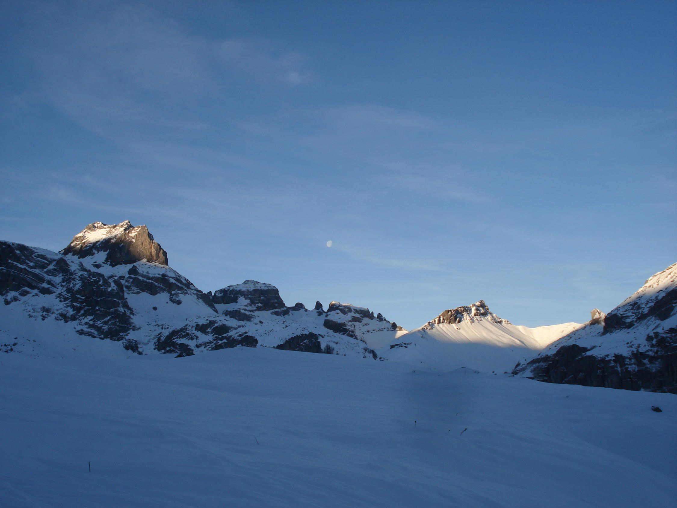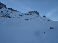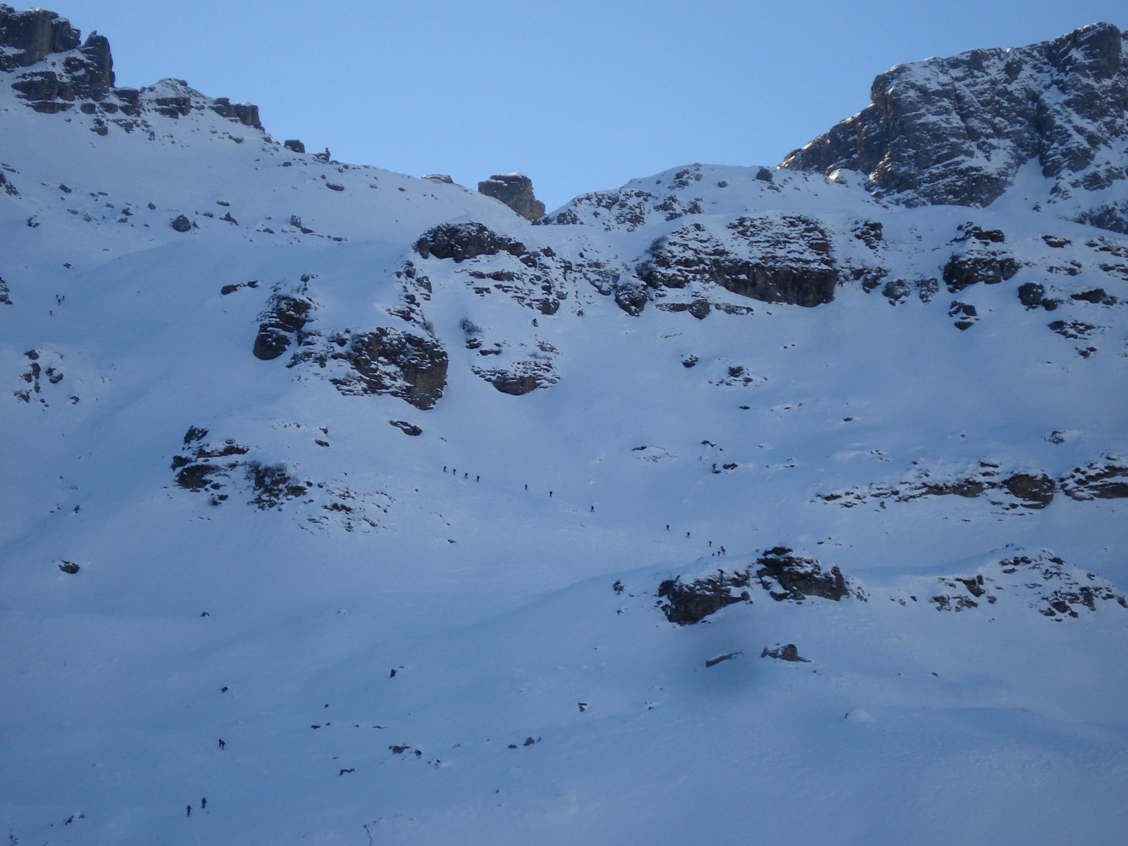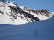 Gute Schneeunterlage, aber leider wenig Neuschnee höchstens 1 Paar Milimeter.Beim Aufstieg rutschige Spur Talwerts Harschteisen wären heute eine gute wahl gewesen, mittelteil leicht Decklig.