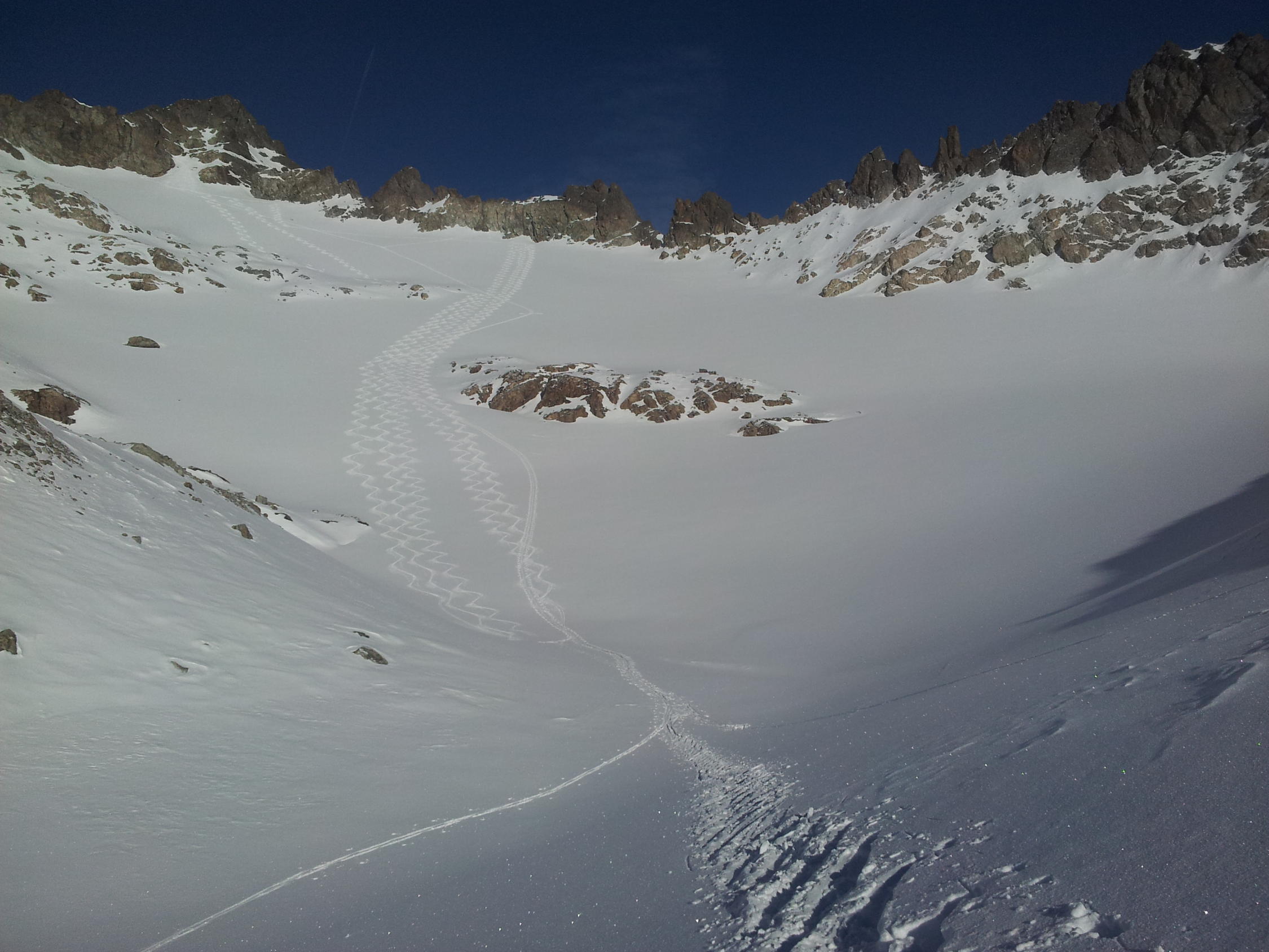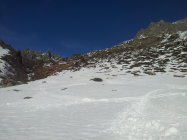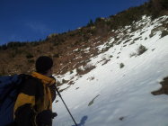 Im Wald fast kein Schnee, eisig, rutschig. Für den Abstieg nicht zu empfehlen.