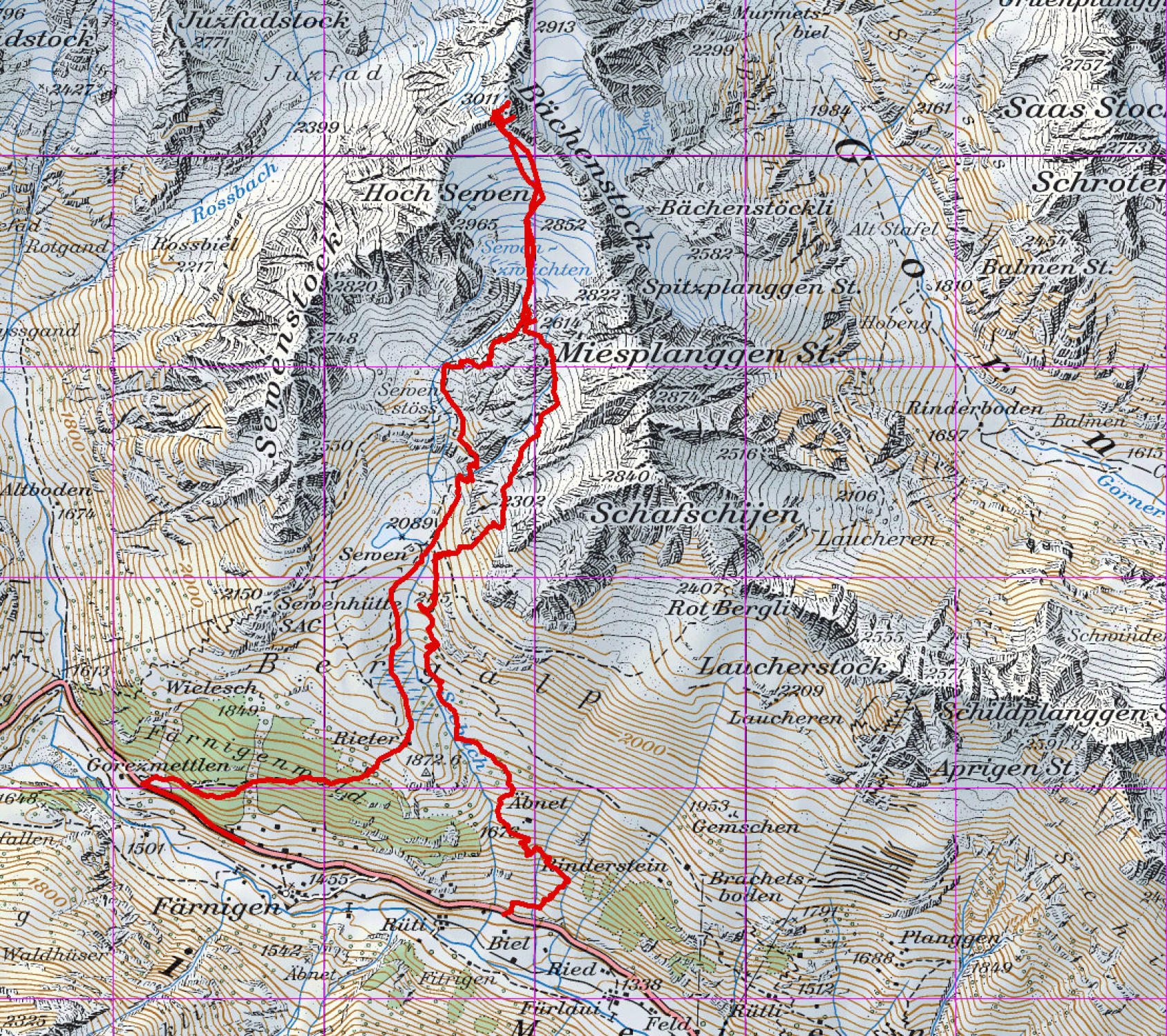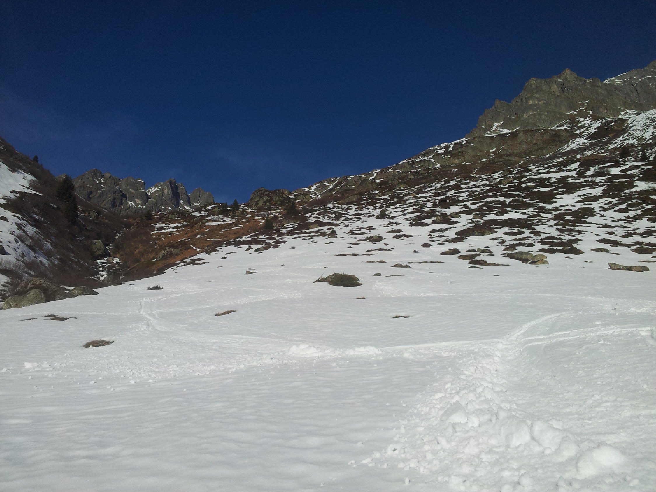 Die Abfahrt über Äbnet, Rinderstein. Allerdings zu wenig Schnee. Die Ski mehrmals getragen. Einige Kratzer.