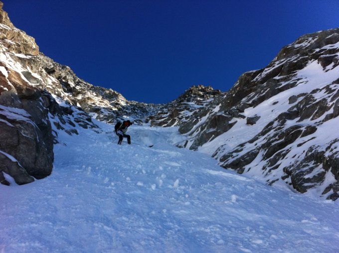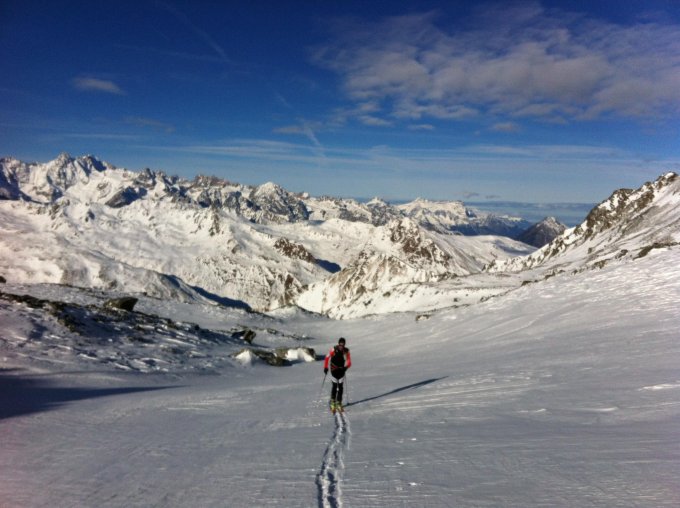 Vom Parkplatz bis Glacier de Proz gute Aufsteigsverhältnisse (knapp genügend auf den Moränen - in den Mulden / Bachtobel top!), Hannibal-Couli erste Hälfte bis zu 40cm Powder, obere Hälfte älterer Schnee, aber stets mindestens Knöcheltief. Kein Eiskontakt ausser auf 1m zuunterst im Couli. Oben raus auf den Gipfeldom windbearbeitet. Abfahrt über Aufstiegsroute - oben griffig, untere Hälfte Powder bis runter zum Parkplatz!