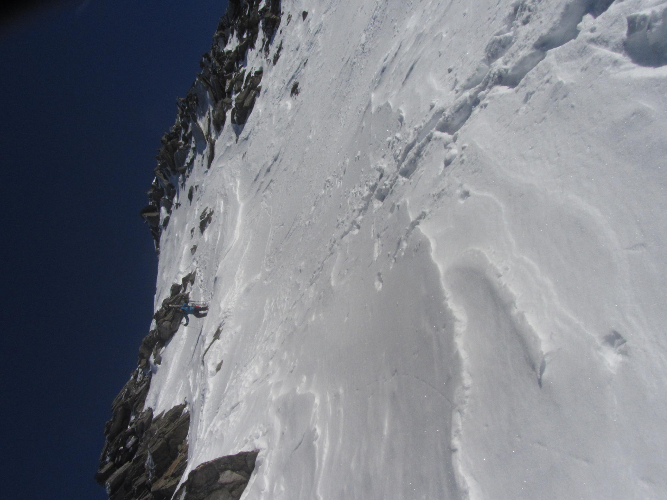 Erstaunlich gut, Neuschneemenge der letzten Tage ist vernachlässigbar klein, Windepresster bis pulvriger Schnee, trotz wenig Schnee konnten wir bis Bhf Oberwald fahren, Grat zum Gipfel in sehr gutem Zustand felsige Stellen trocken und sonst guter Tritschnee