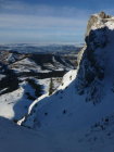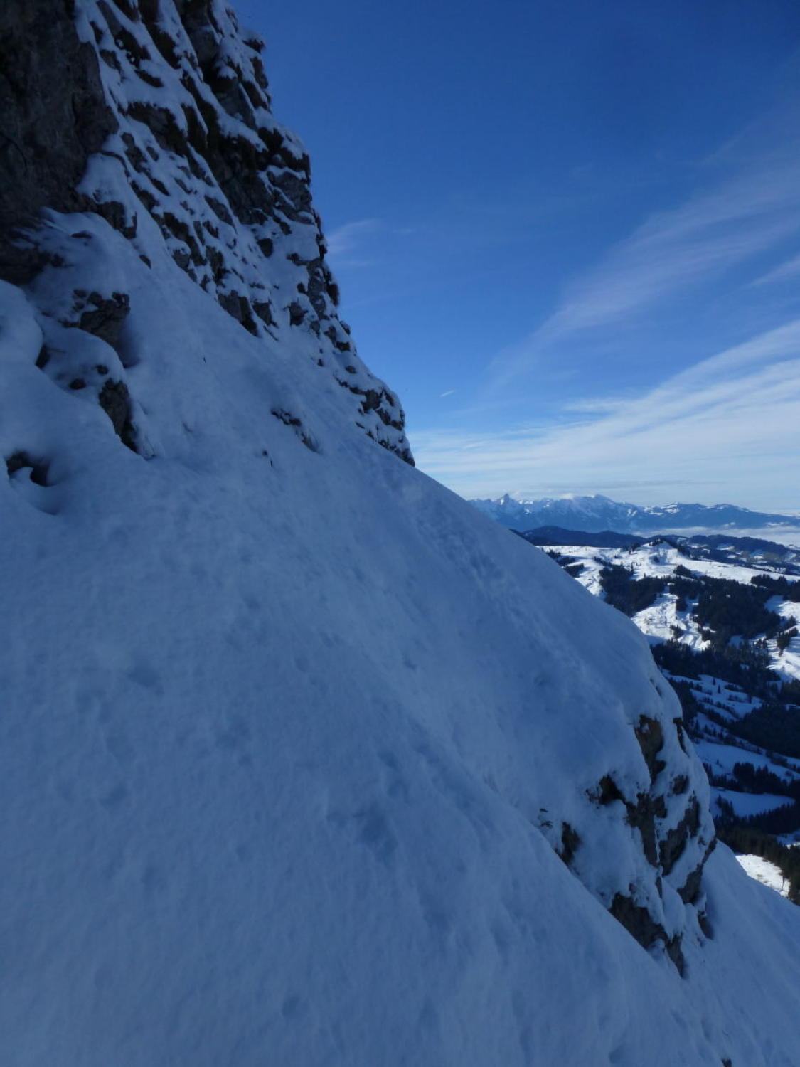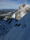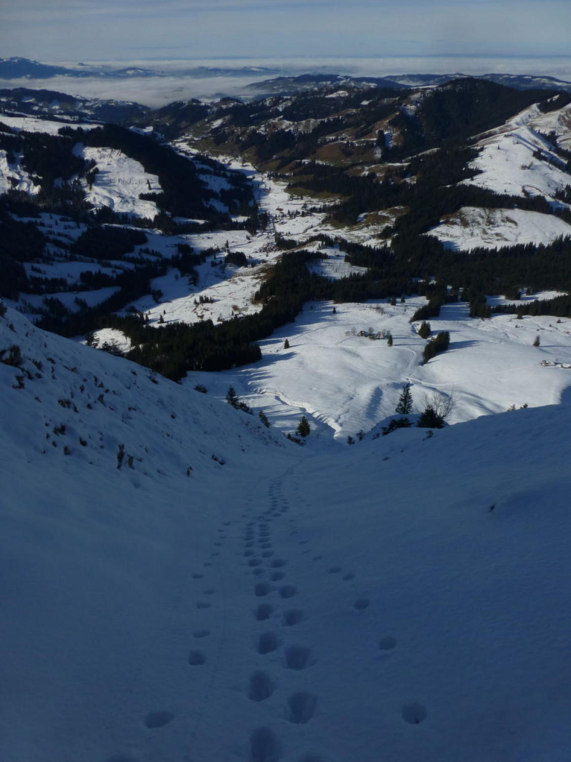 Nebelmeer auf ca. 800m, darüber sonnig und mild. Ca. 5-10cm Neuschnee auf ca. 20-30cm z.T. nicht tragender Unterlage. Im Aufstieg abwechselnd Wühl- und Trittschnee, bei der Abfahrt abwechselnd hart und durchbrechend mit vielen Gras- und Steinkontakten. Insgesamt miserable Schneeverhältnisse...