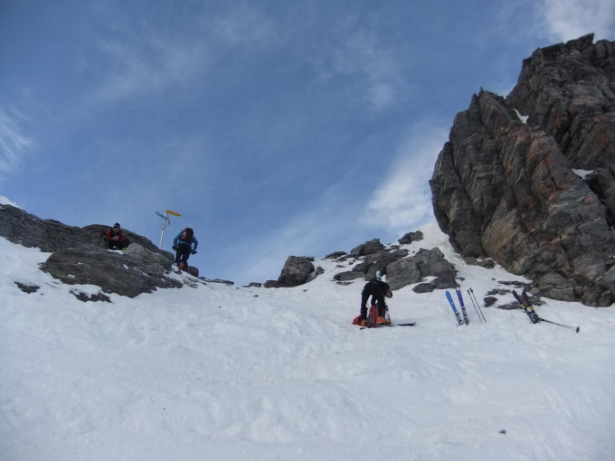 Der Wildsee läßt sich gut überqueren. Der Gletscherrest ist reichlich mit Schnee versehen. Am Grat waren Steigeisen nicht nötig, da die kurze Felspassage wegen südseitiger Lage ab Skidepot teilweise schneearm war. Das Drahtseil war frei.