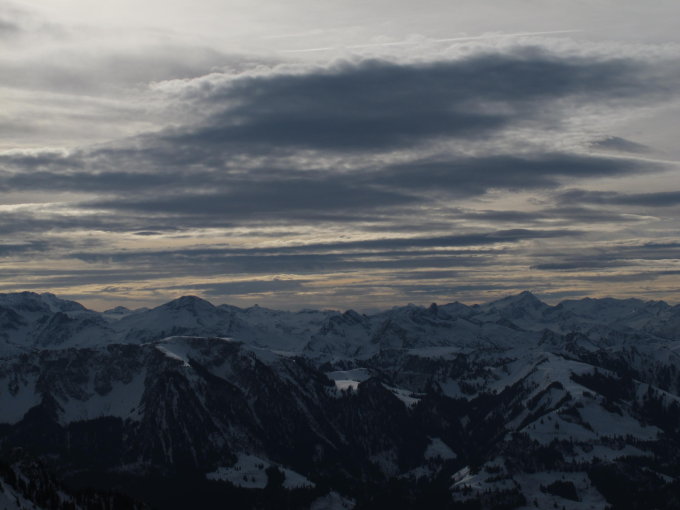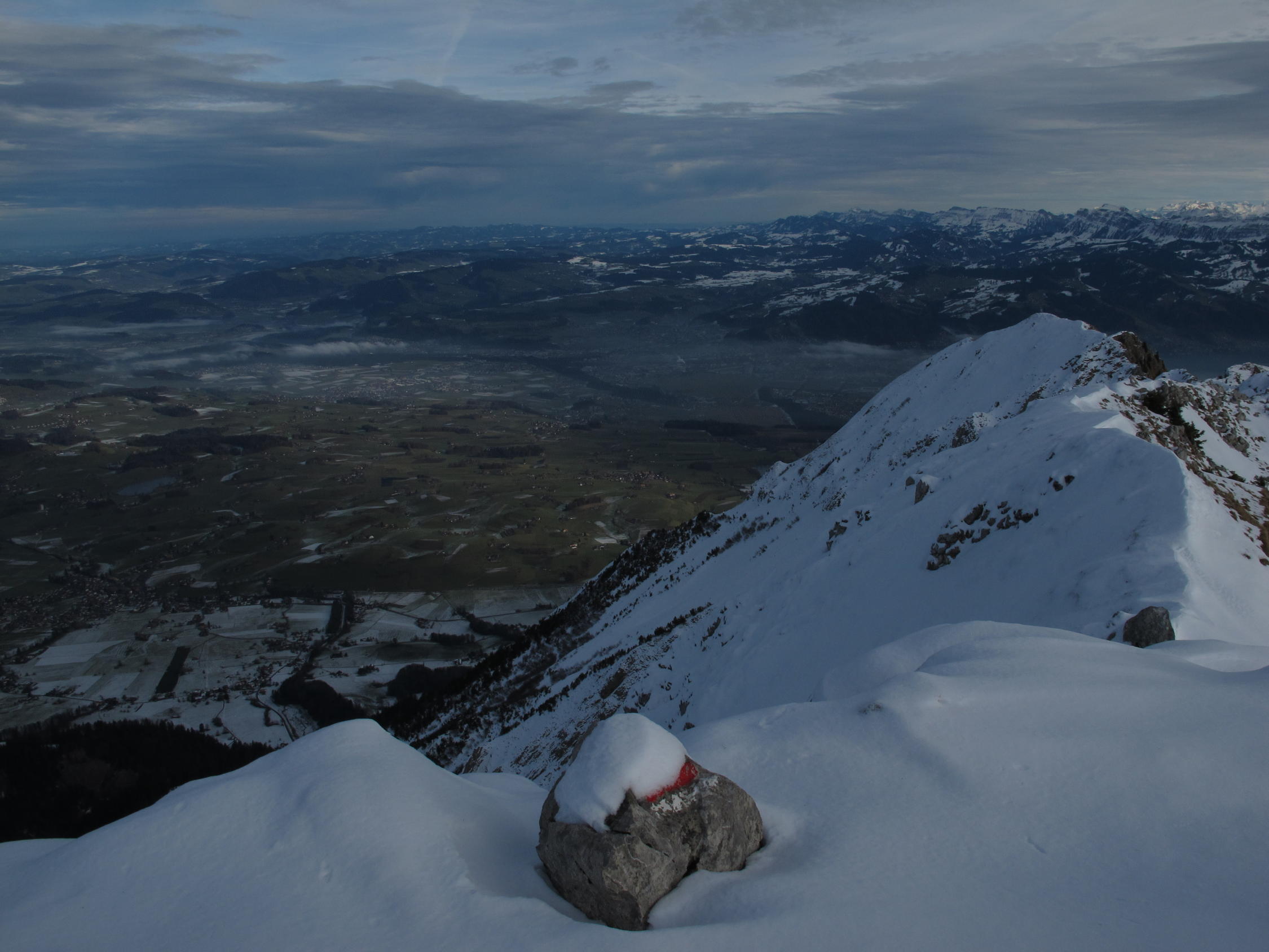 Wenig Schnee, aber Pulver, unten hart, fahrbar bis 900m.ü.M. Oben starker Wind aus SW mit Verfrachtungen des Neuschnee. Im Mittelteil der Tour ist der Schnee stark aufgebaut und man hat deshalb immer wieder Boden-und Steinkontakt