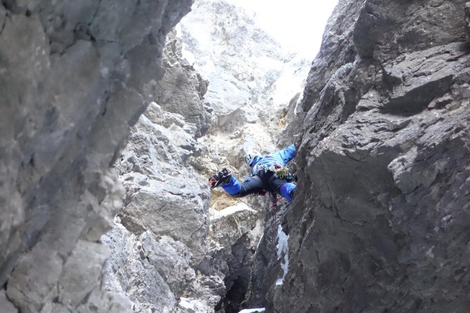 Material: 8 Express, 60 m Doppelseil, Steigeisen, Eisgeräte. Je nach Eisauflage mind. 3 bis 6 Eisschrauben, vor allem kurze. Zur Reserve, d.h. falls fixe Sicherungen unter dem Schnee verborgen bleiben, ist ein kleines Hakensortiment dringend empfehlenswert sowie einige Cam´s (Cam 3 obligat in der 7. Länge).