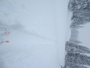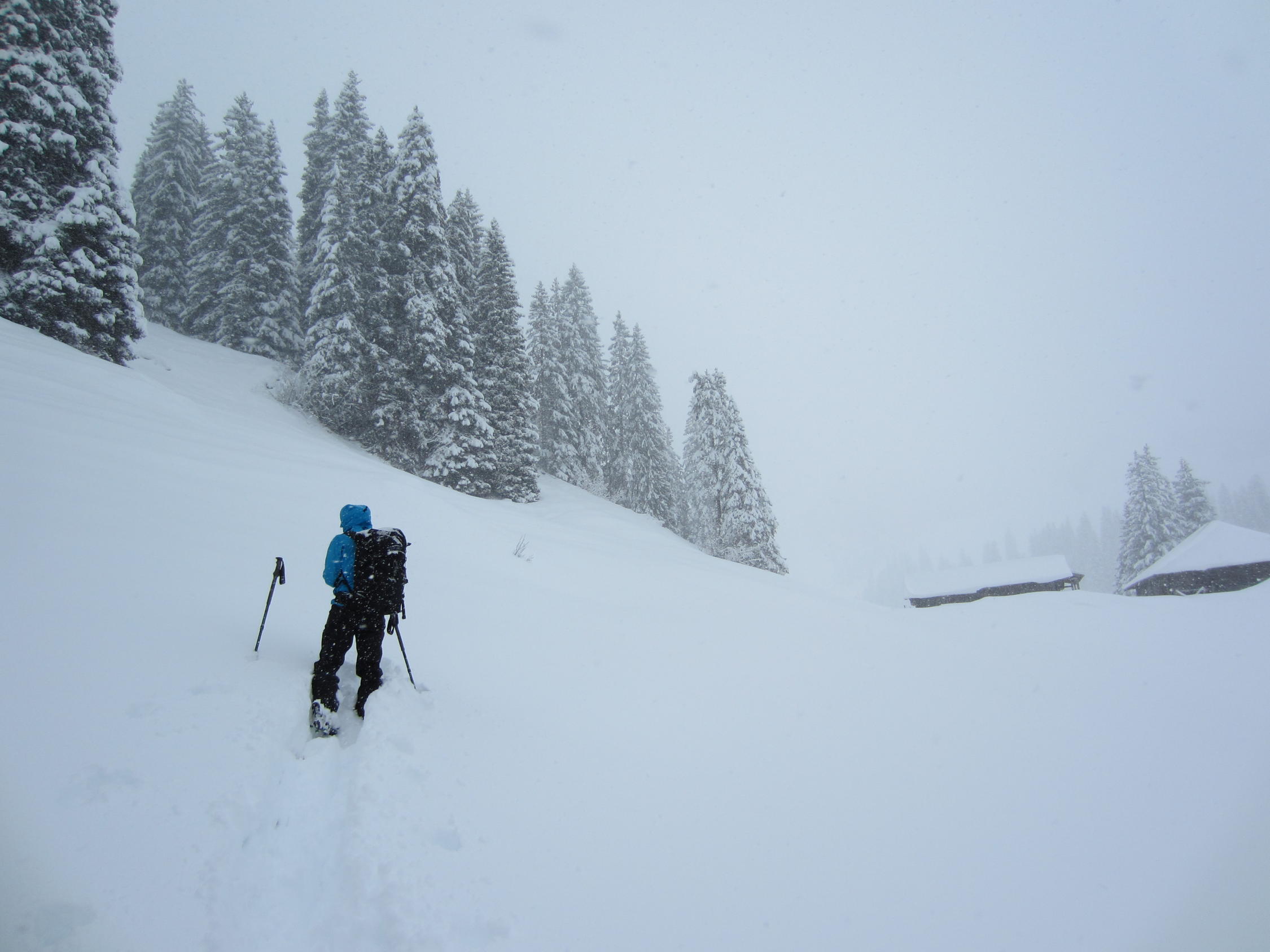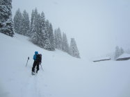 Oberhalb 1450 30cm zunehmend. Teilweise starke Windverfrachtungen. Stellenweise sind wir bis 70cm im Pulver gestanden.