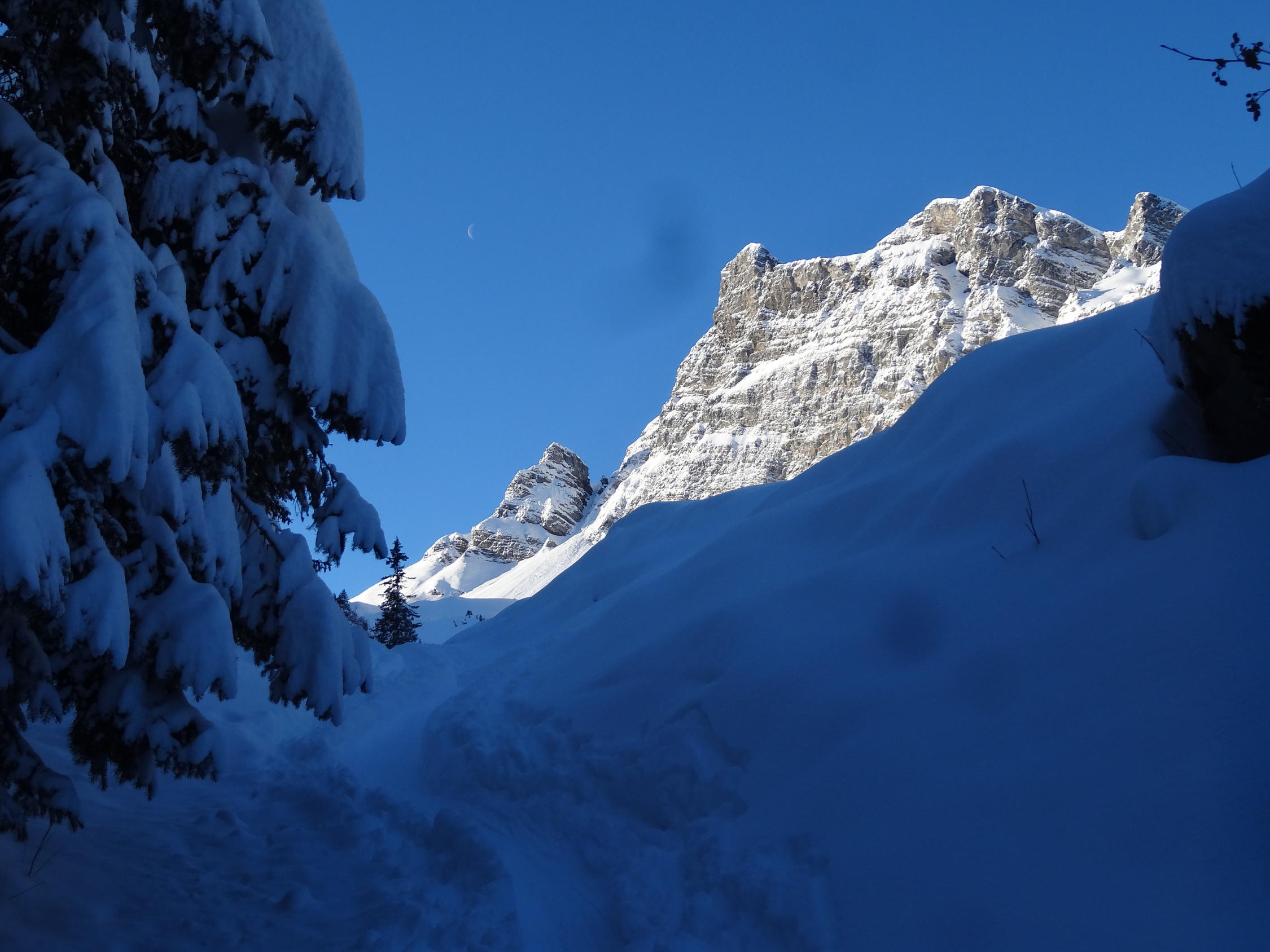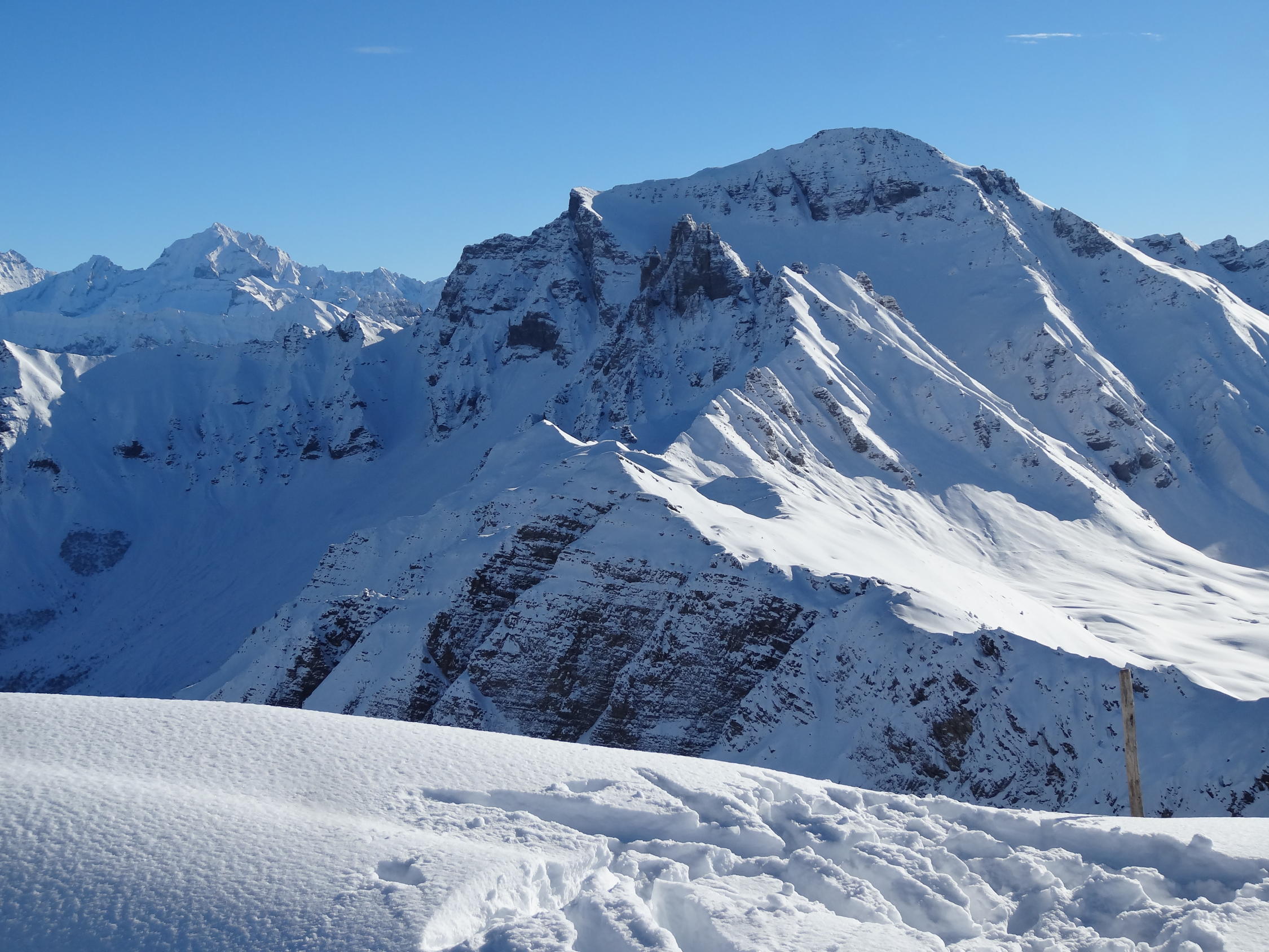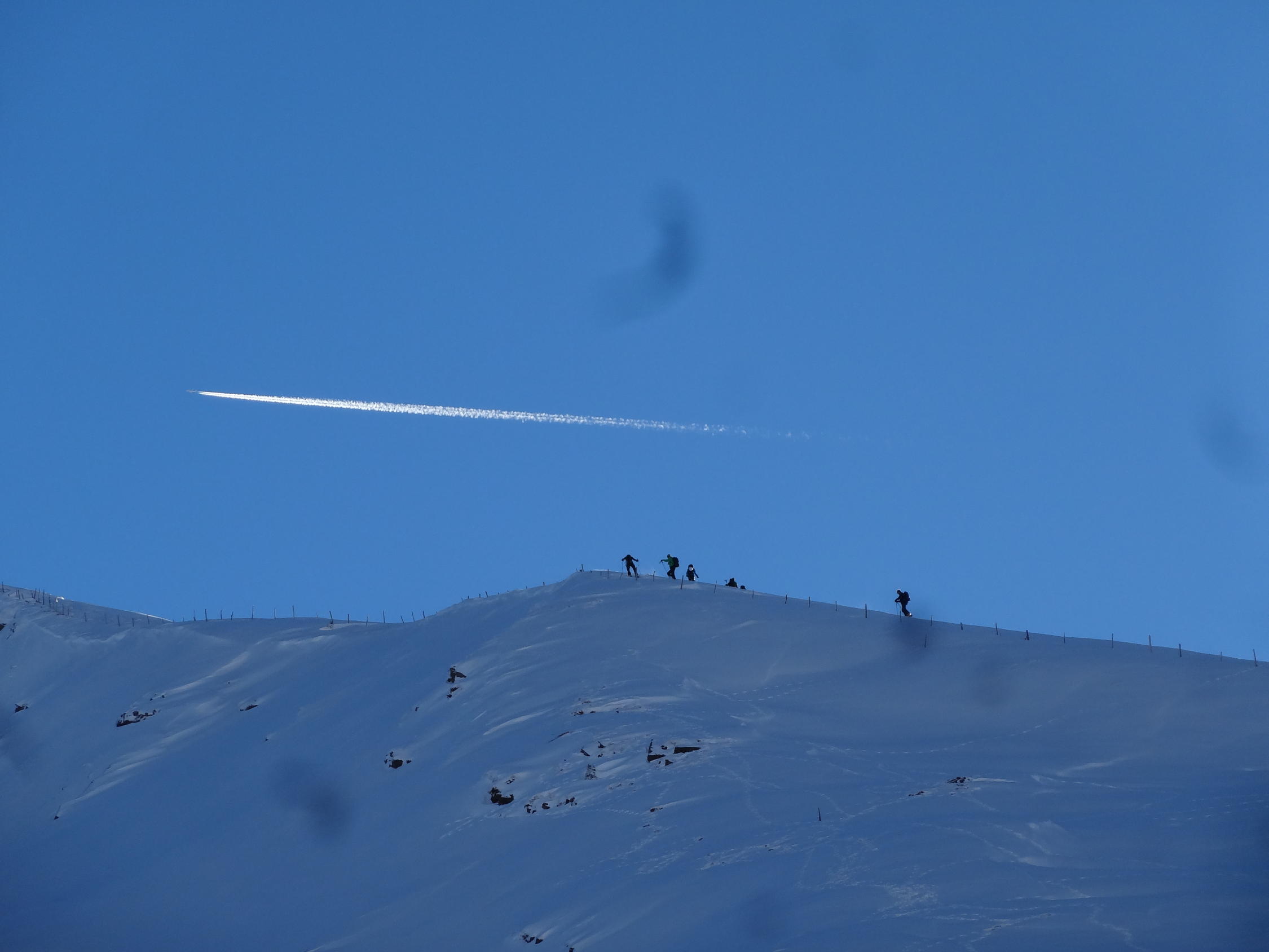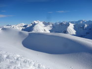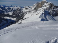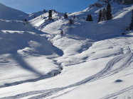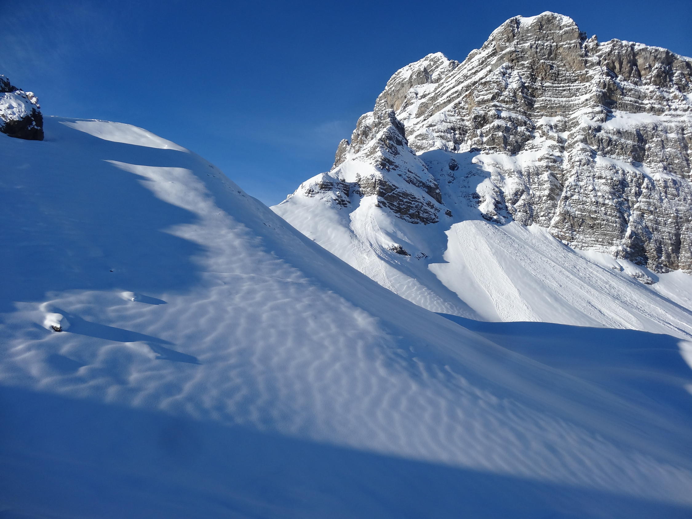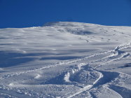 Bis Gipfel leichter Pulverschnee, mit wenigen verdeckten Triebschnee-Ansammlungen.