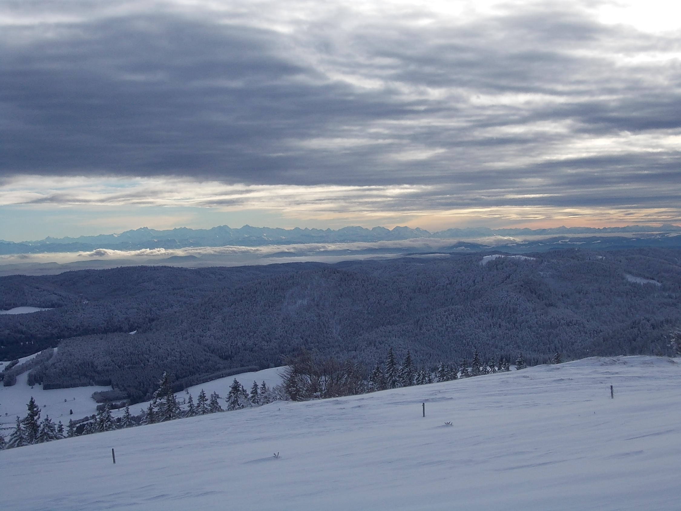 Morgens sonnig,später hochwolkig, mit bester Fernsicht. Die Alpenkette von den Allgäuern bis zu den westlichen Bernern, dazu Jura und Vogesen - was will man mehr?