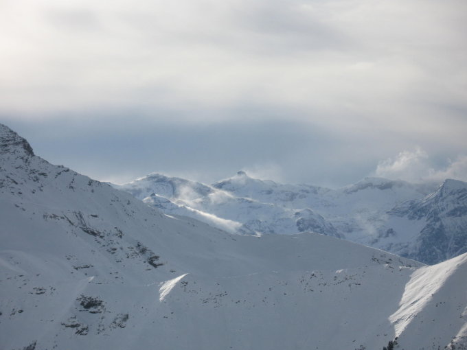 Temperatur auf der ganzen Route um 0°, trotz starken bis stürmischen Winden auf Teilen der Route. Schnee hat es nach wie vor nicht zu viel, entsprechend gab es auch Steinkontakt im Wald um 1600m und dann im Hang oberhalb der Langlaufloipe. Ansonsten gut fahrbar. Der Gipfelhang fahrbar mit windgepressten Anhäufungen.