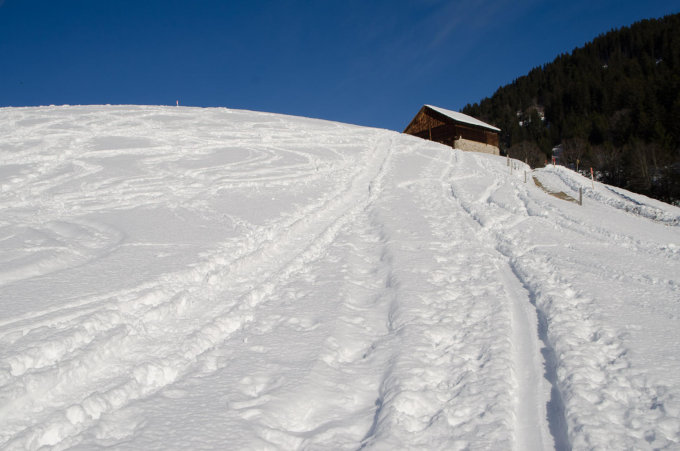 Die Schlittelpiste nach Matt ist offen, hat aber recht wenig Schnee. Ohne Kratzer im Belag kommt man fast nicht runter.