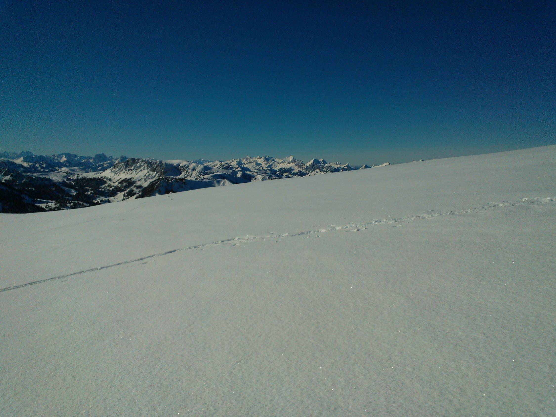 Im Aufstieg von Beginn weg schneebedeckt, nur ein paarmal kurz Ski abziehen im Gandgraben nötig, weil Baumstrünke etc. nicht alle überschneit sind. Nach dem Gandgraben problemlos bis auf den Gipfel. Schneemenge mit der Höhe zunehmend, es hat jetzt oben ordentlich Schnee. Abfahrt: ich bin "hintenrum" abgefahren, also zuerst Richtung Niederhorn. Die oberen, weiten Hänge waren sehr genussreich, Pulver ohne Steine. Weiter unten bin ich dann auf einer Alpstrasse unter dem Turne durchgequert und habe so nochmals schöne Hänge gewonnen, Schnee dort allerdings schon gedeckelt. Nach nochmaliger Alpstrassenfahrt dann die letzten Hänge bis zum Schulhaus in Zwischenflüh, ging insgesamt sehr ordentlich.