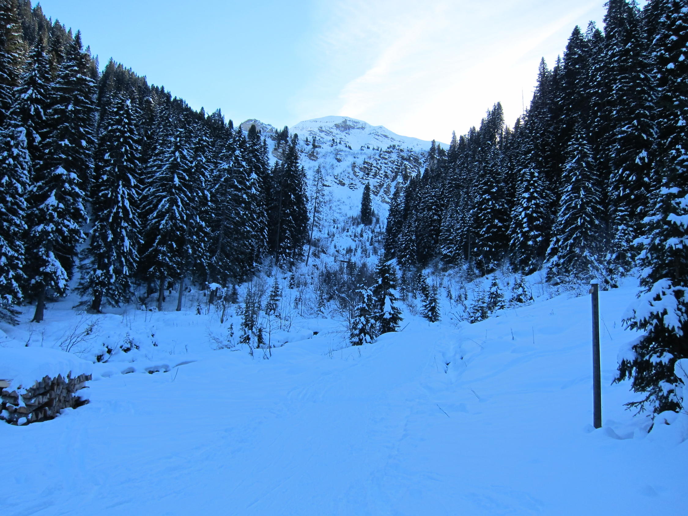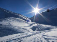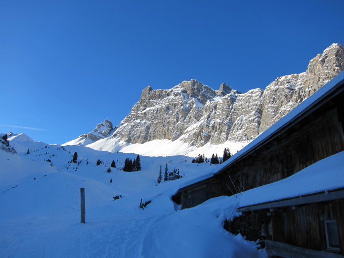 Pulver von oben bis unten, es hat genug Schnee. Minimaler Steinkontakt auf dem Waldweg. Der Gipfelhang ist jedoch stark verfahren. Heute waren zig Tourengänger am Rauflihorn anzutreffen.