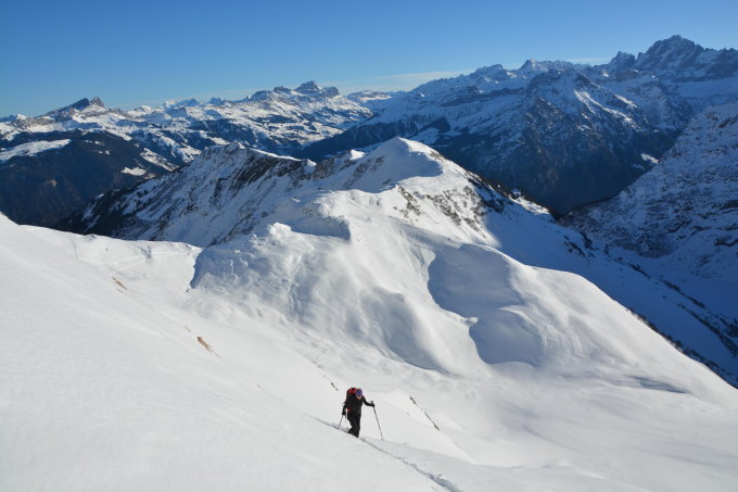 Die Spuren unserer Vorgänger endeten beim Nusfruttli. Wir hatten die Ehre bis zum Gipfel neu zu spurten. Auch der Gipfelhang war im griffigen Schnee zu begehen. In der Abfahrt bis zum Surenenpass einige Steinkontakte, aber gut zu fahren. Ab dem Surenenpass schöner Pulverschnee bis zum Waldnachter Boden, der jetzt auch gespurt ist. Wir haben wieder angefellt und sind schliesslich noch bis zum Schwandiberg abgefahren, was gut machbar ist.