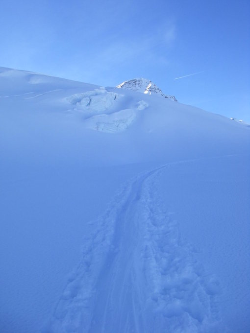 Schöner Pulverschnee, ganz oben teilweise verblasen und verfrachtet. Gletscher gut eingeschneit. Fast windstill aber ca. -14 Grad kalt.